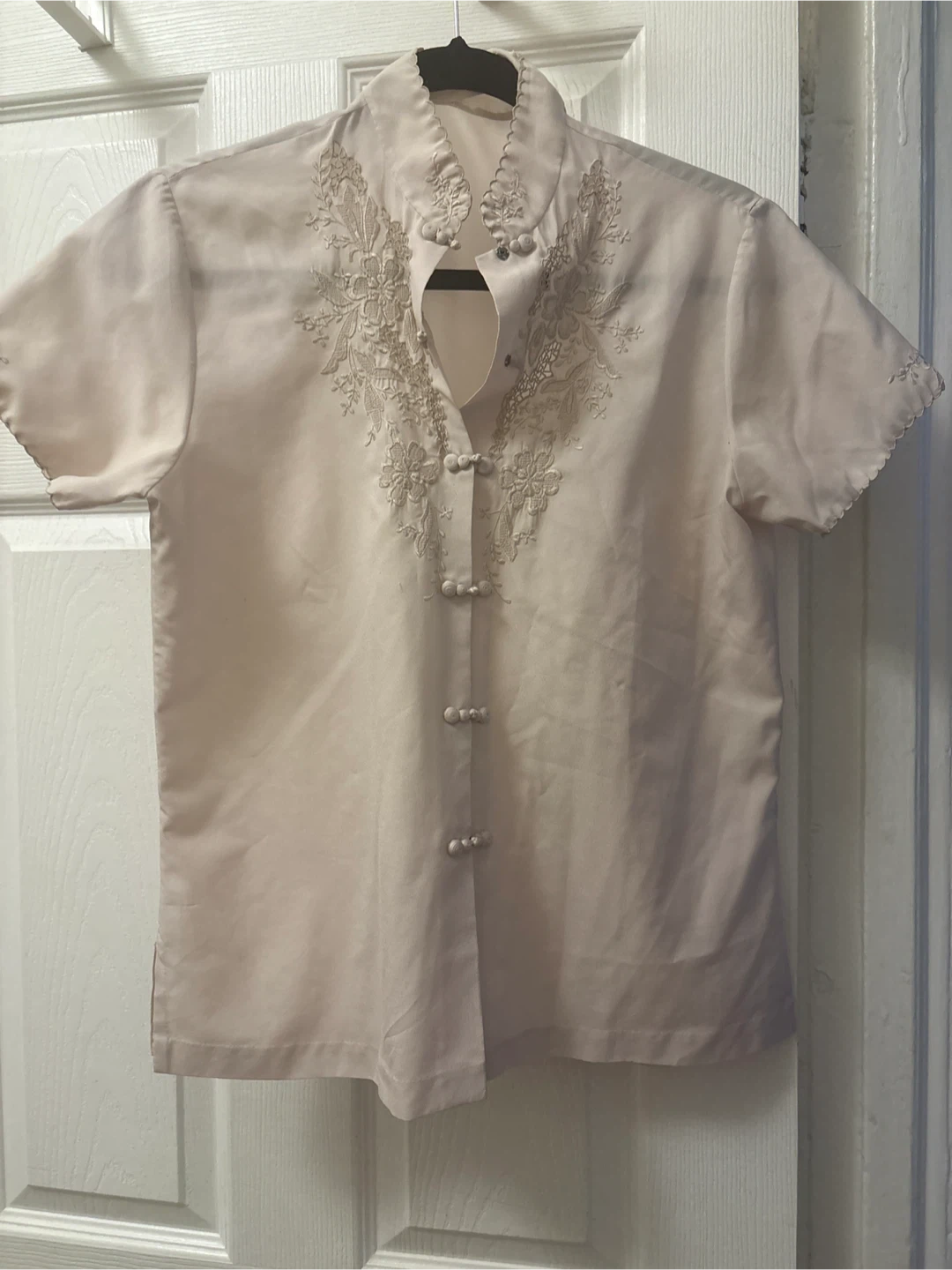 This women's short sleeve blouse features a traditional mandarin collar with delicate embroidery and ornate frog button closures. It's made from a smooth, light-colored fabric that drapes nicely. The scalloped edges on the collar and sleeves add a charming detail.