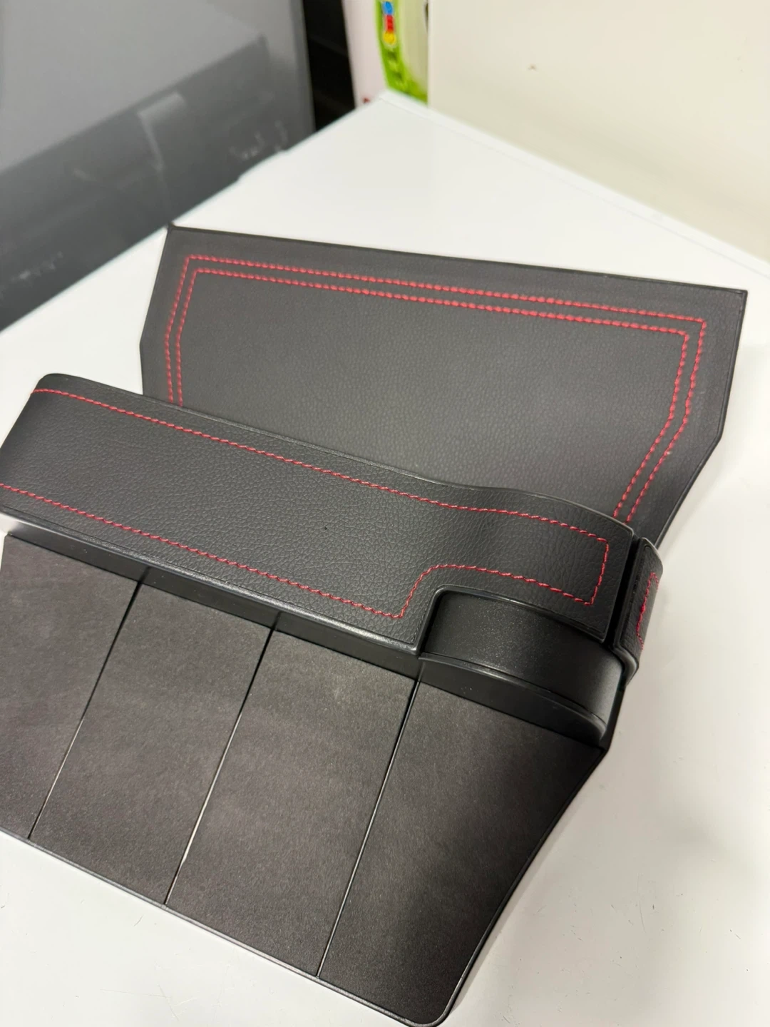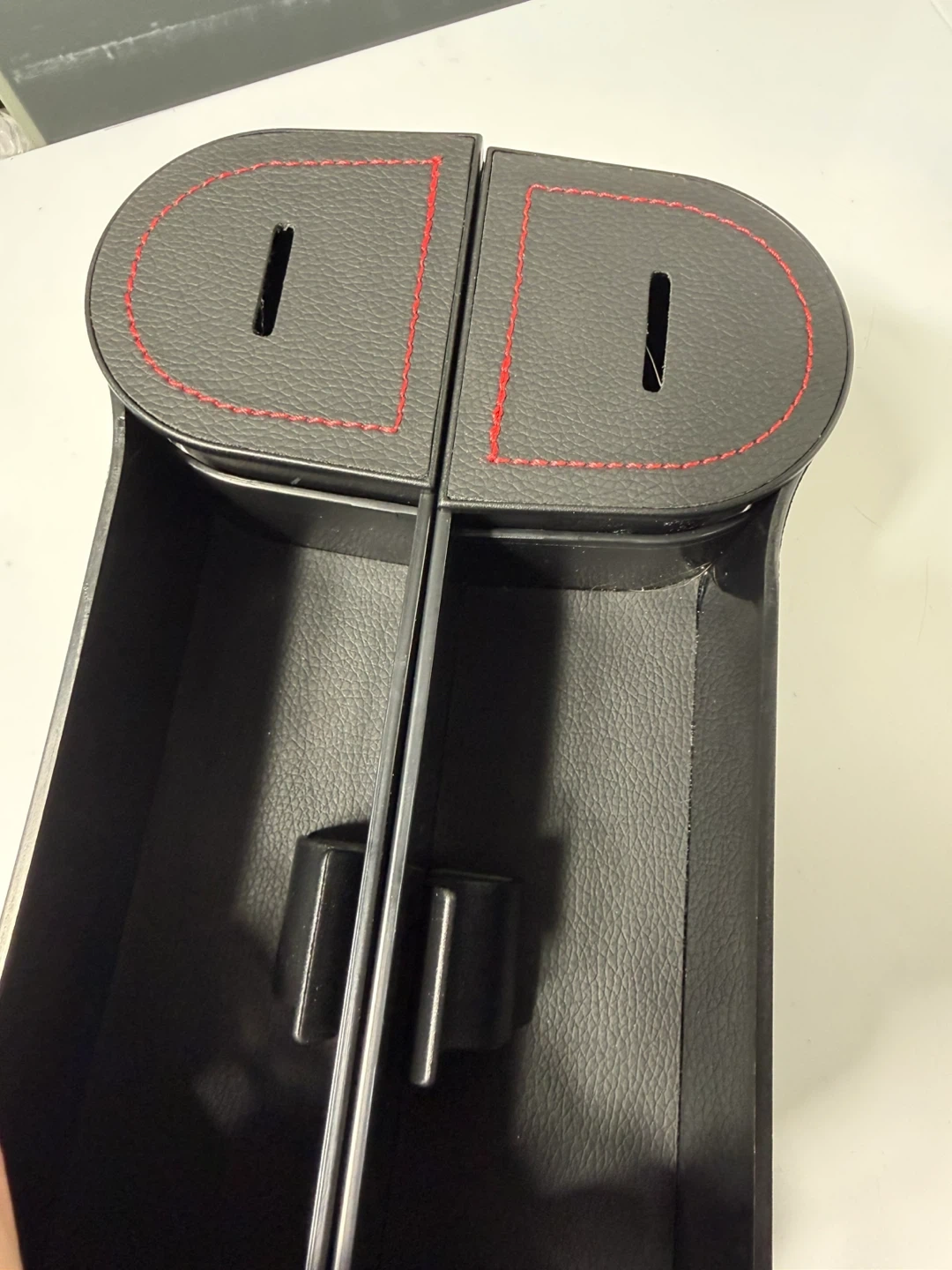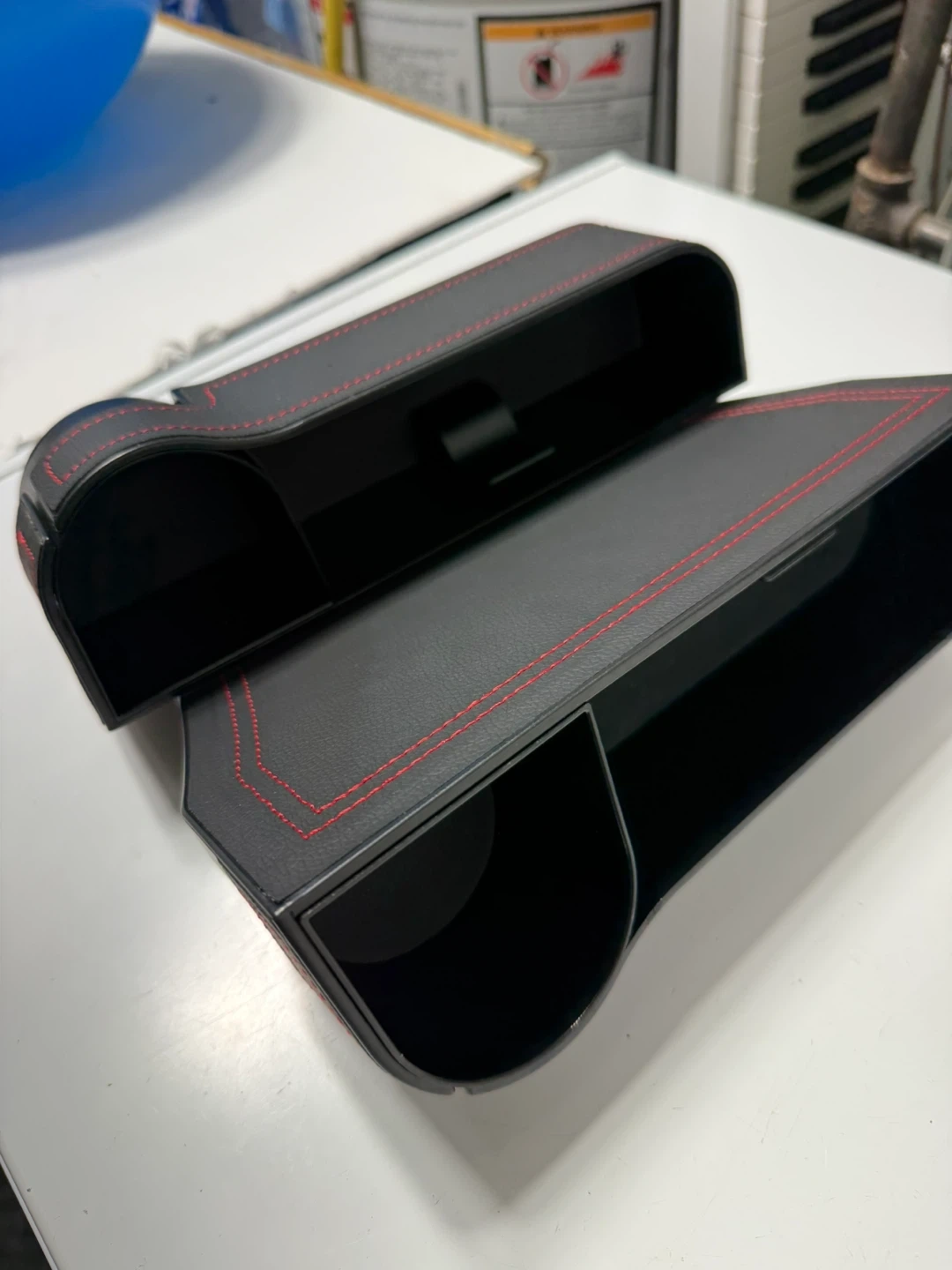 This set includes two car seat gap organizers, designed to fit snugly between your car seat and the centre console. They're made from durable black faux leather with contrasting red stitching for a stylish look. Keep your essentials handy and prevent items from falling into the gap!