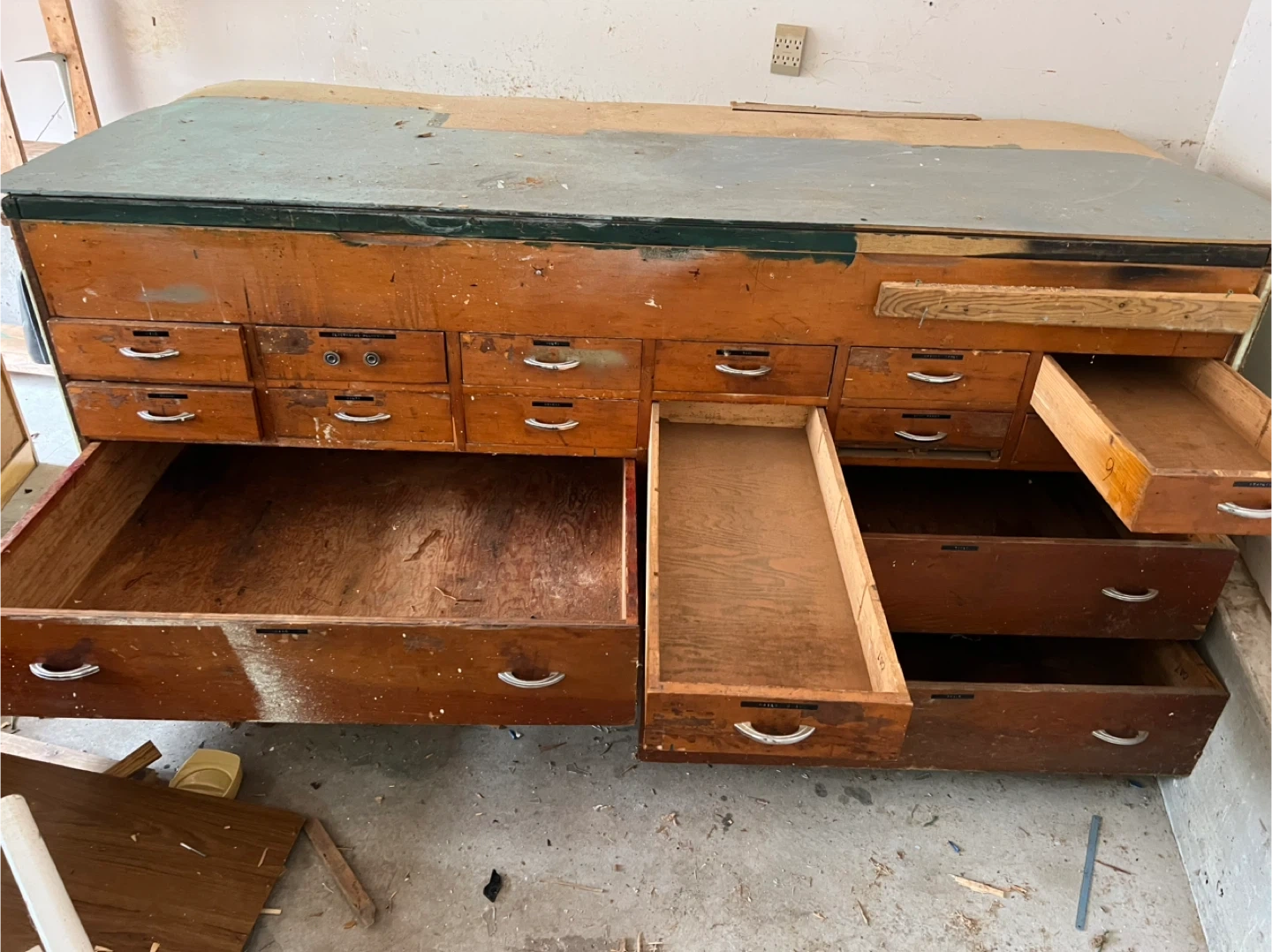 This is a large wooden workbench with numerous drawers for storage. It is very sturdy, possibly for a workshop or garage. Great for organizing tools or supplies!