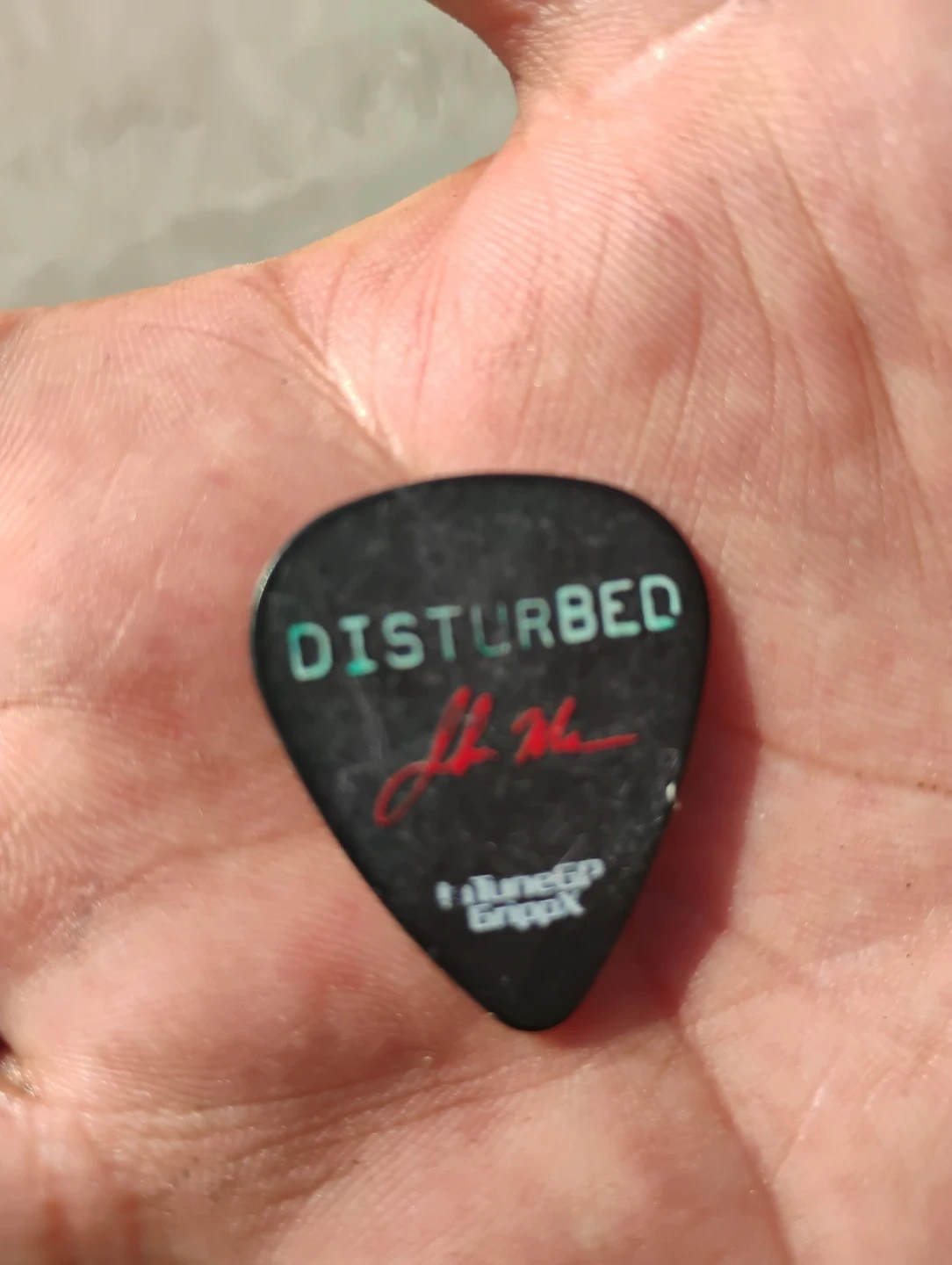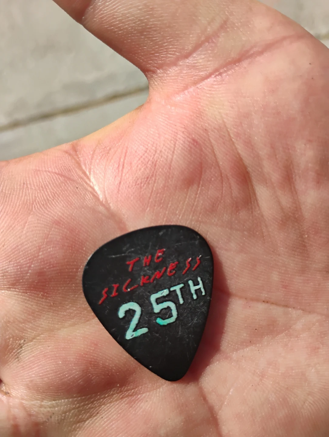 This is a guitar pick from the band Disturbed. It features the band's name and a machine signature. The other side says 'The Sickness 25th. The pick was caught at a concert!