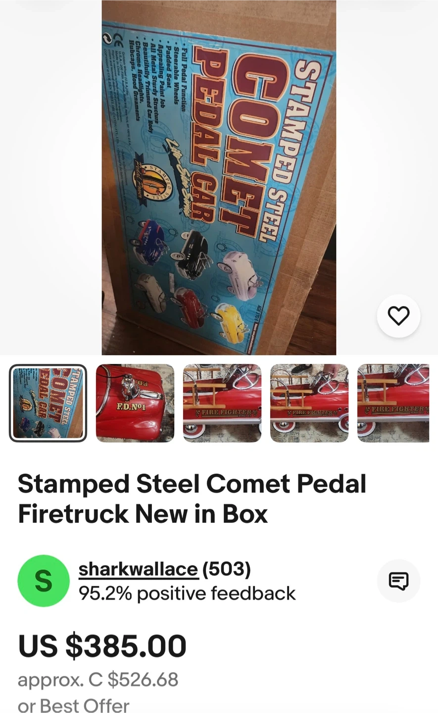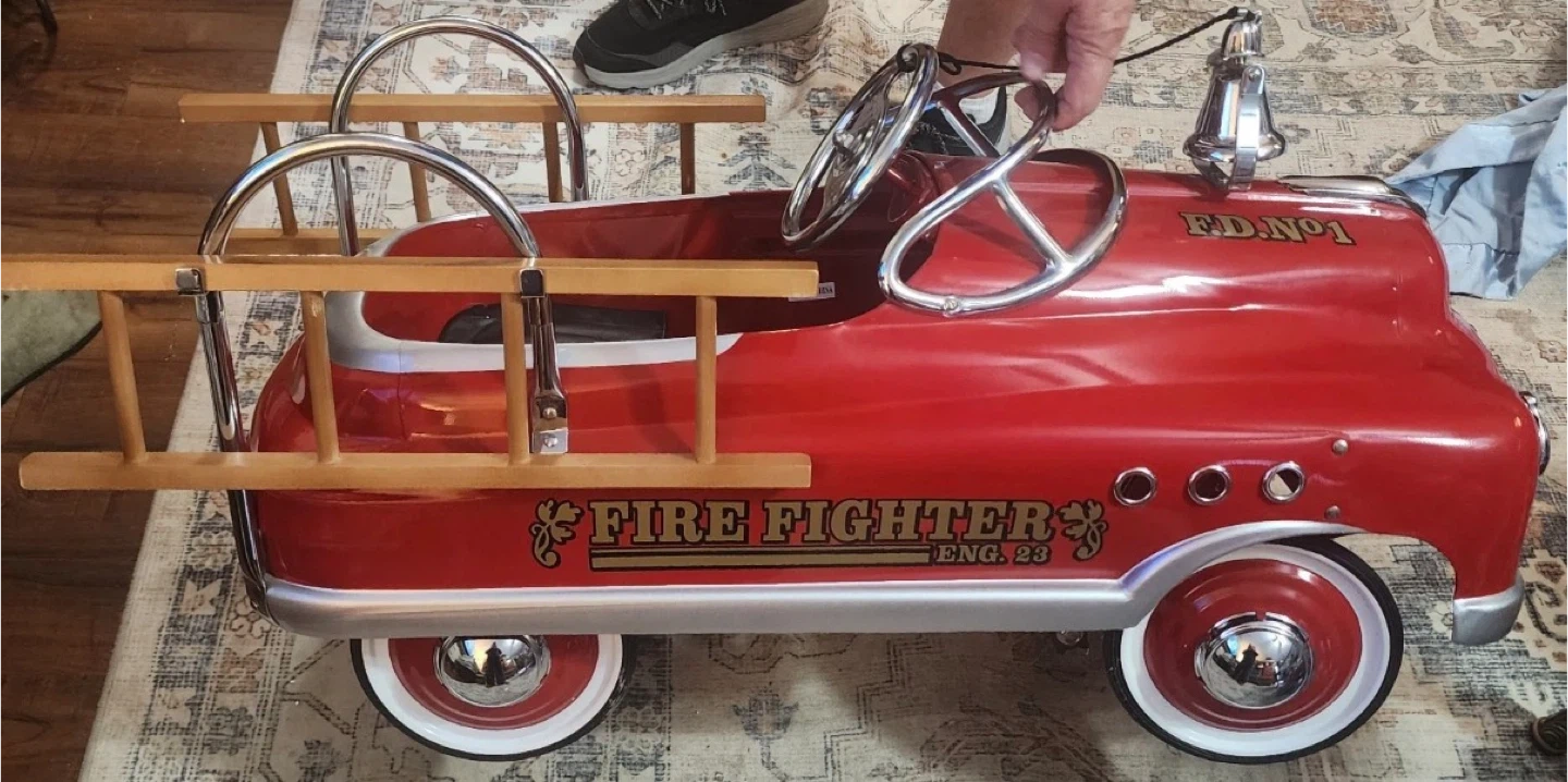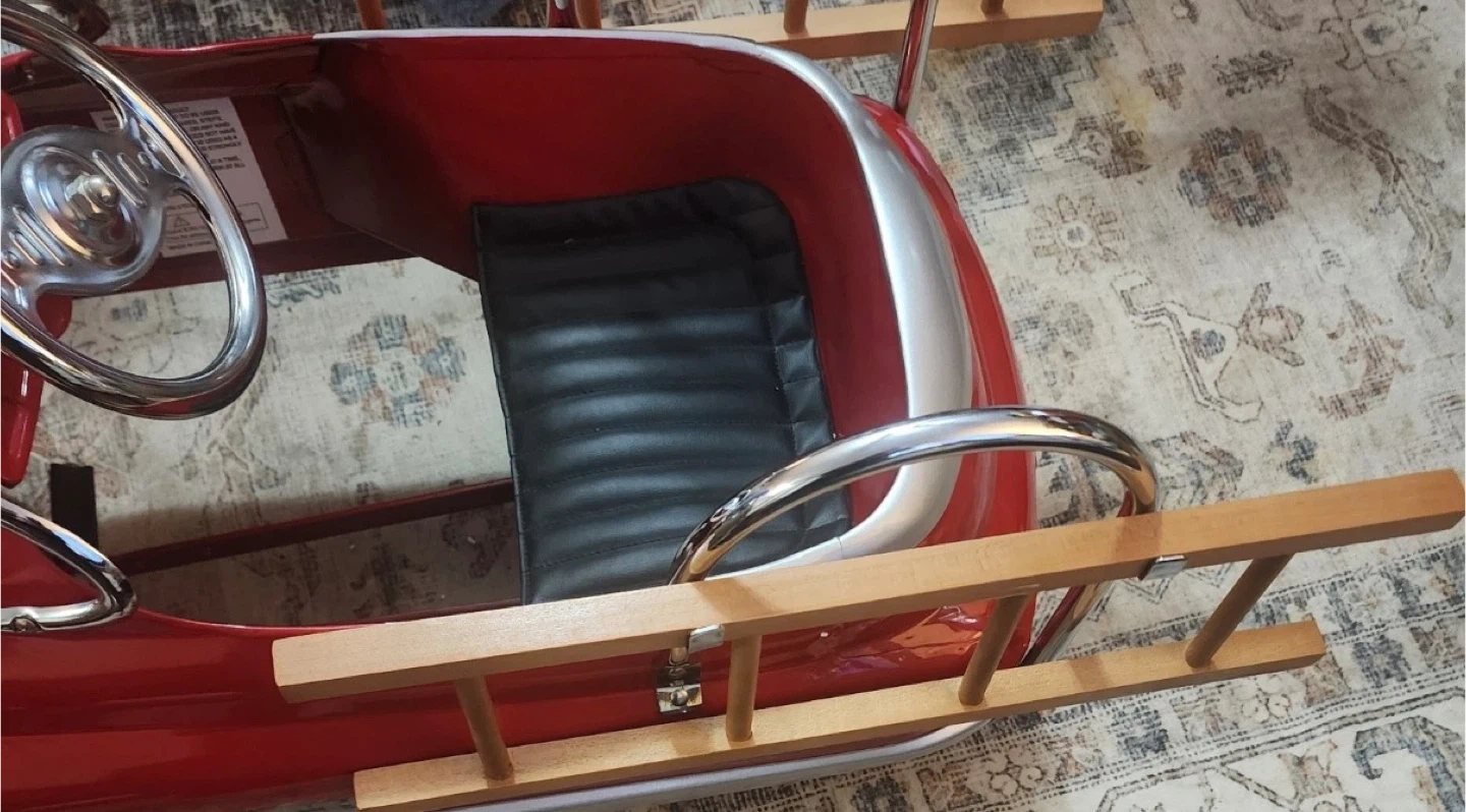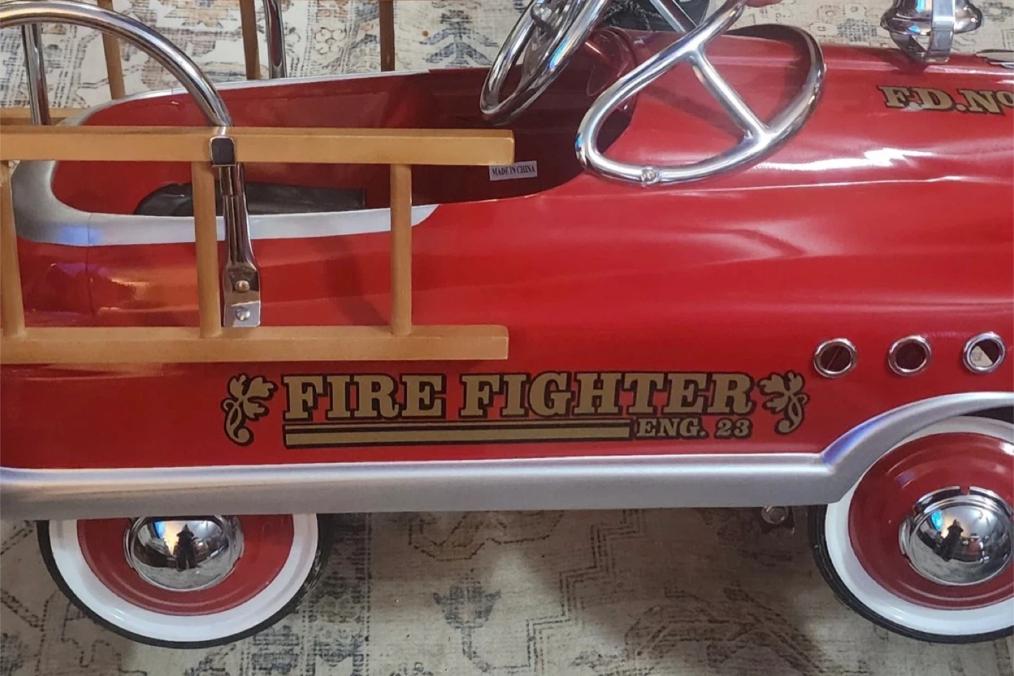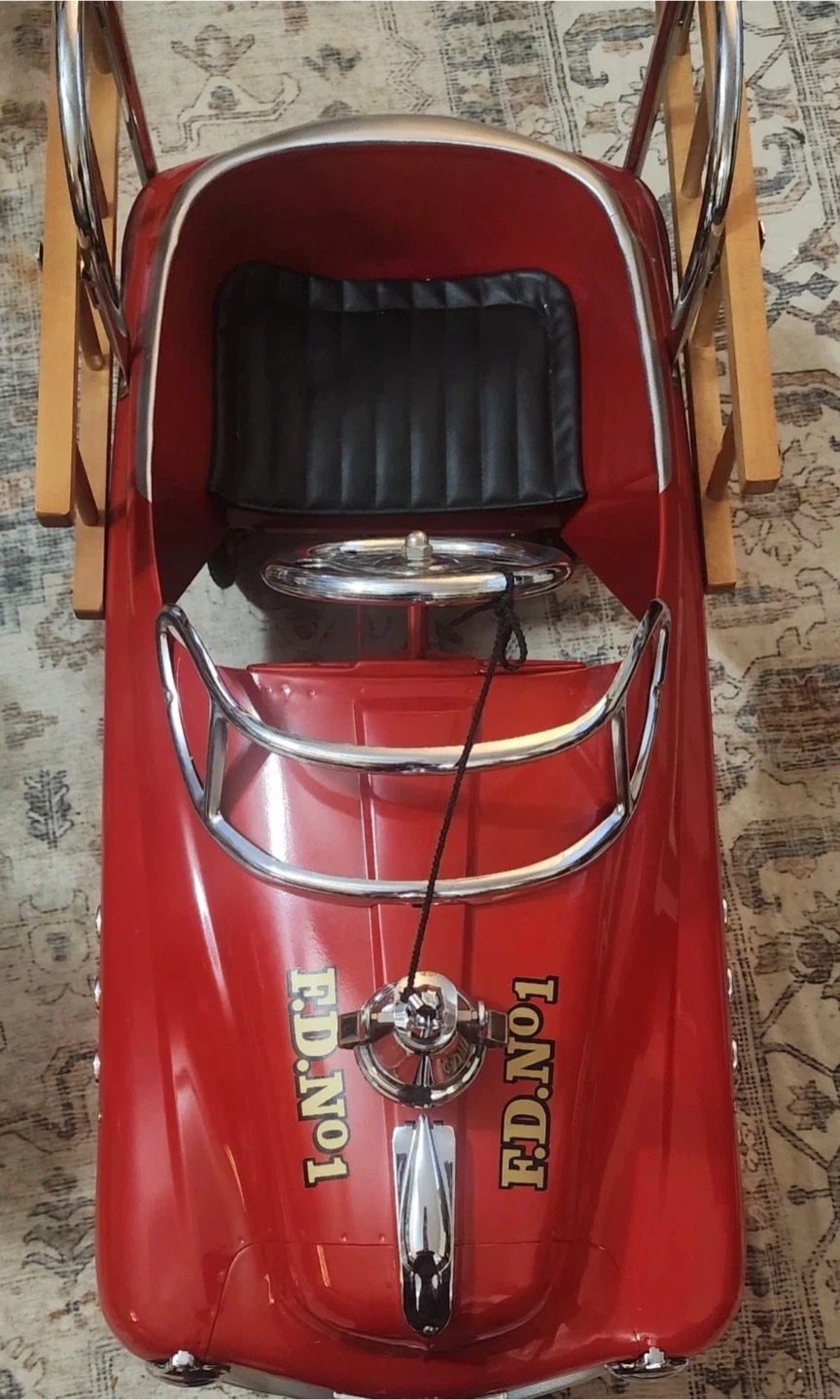 This is a fun red pedal car designed like a fire truck. It has "FIRE FIGHTER" and "FD. NO.1" decals. Includes wooden ladders and chrome accents. It's perfect for little ones who dream of being firefighters!