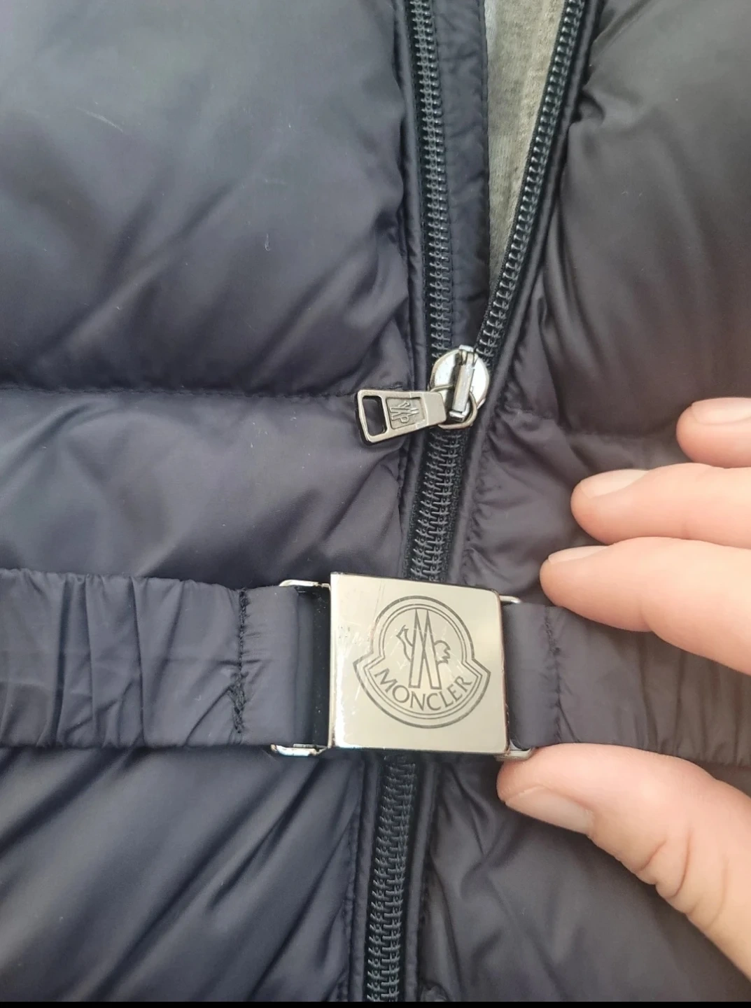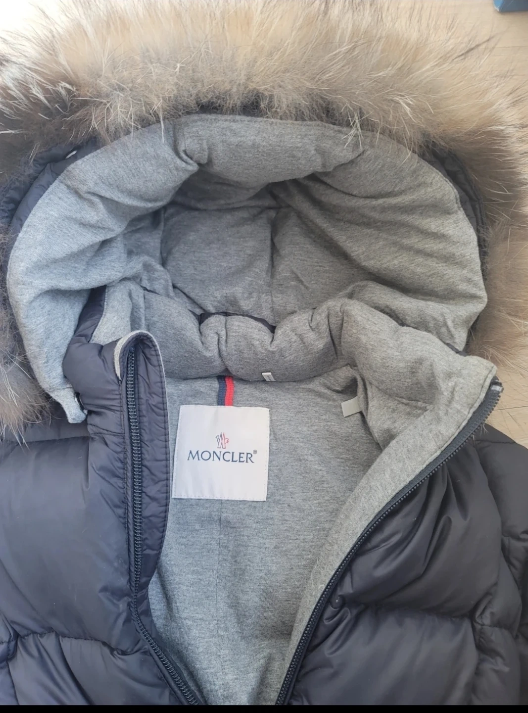 This is a Moncler kids snowsuit. Size 3, which is 100cm. It's a navy blue puffer snowsuit with a detachable fur-lined hood. Features a front zipper and a belt with a Moncler logo buckle.