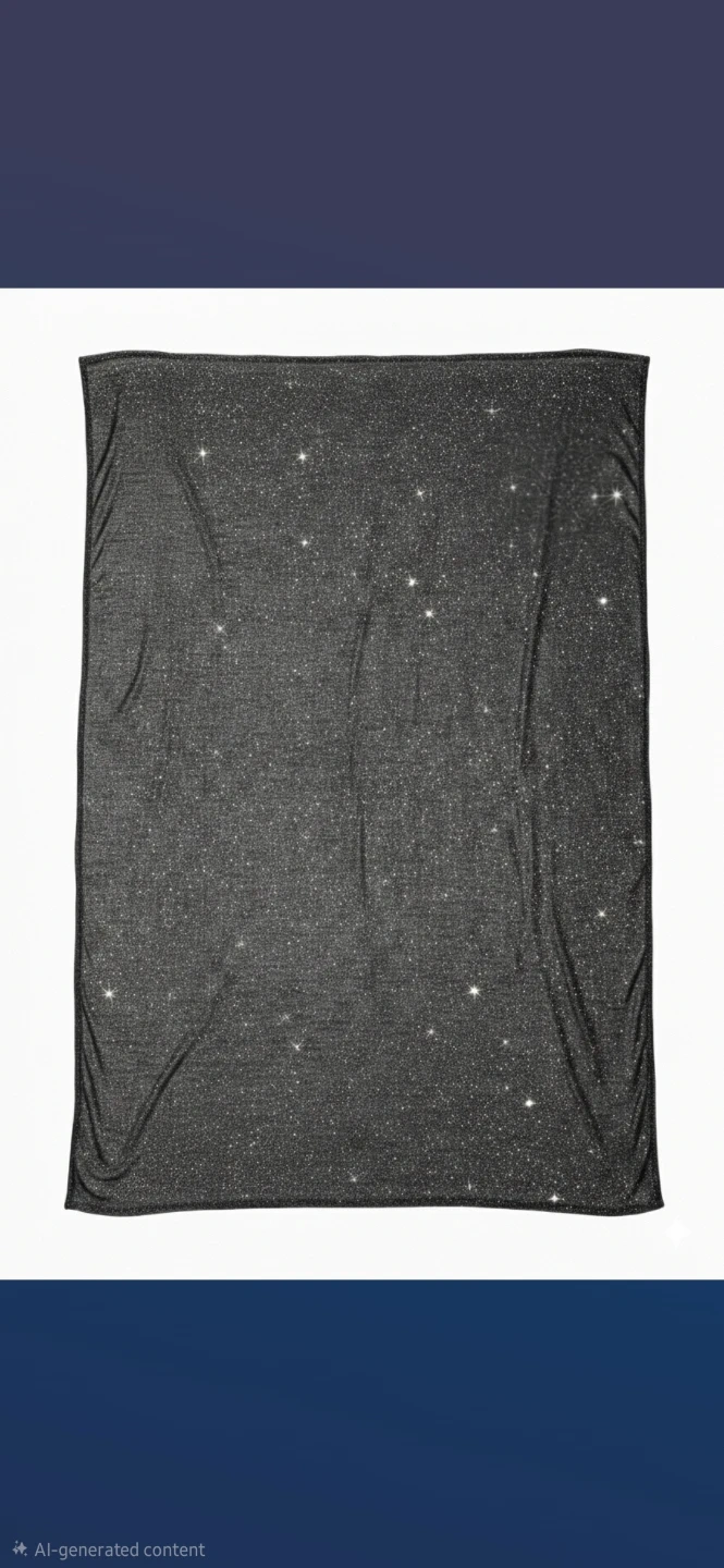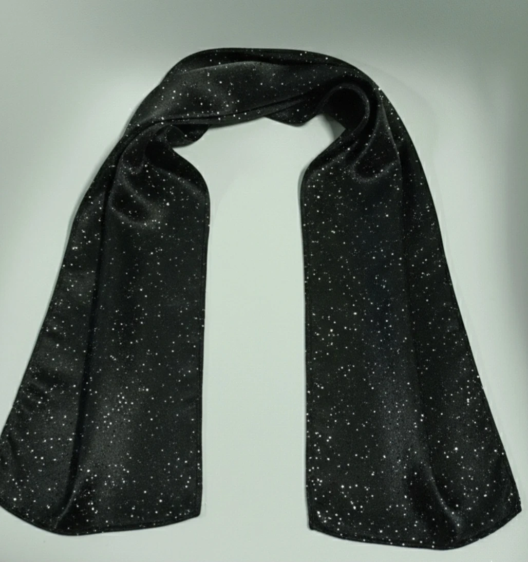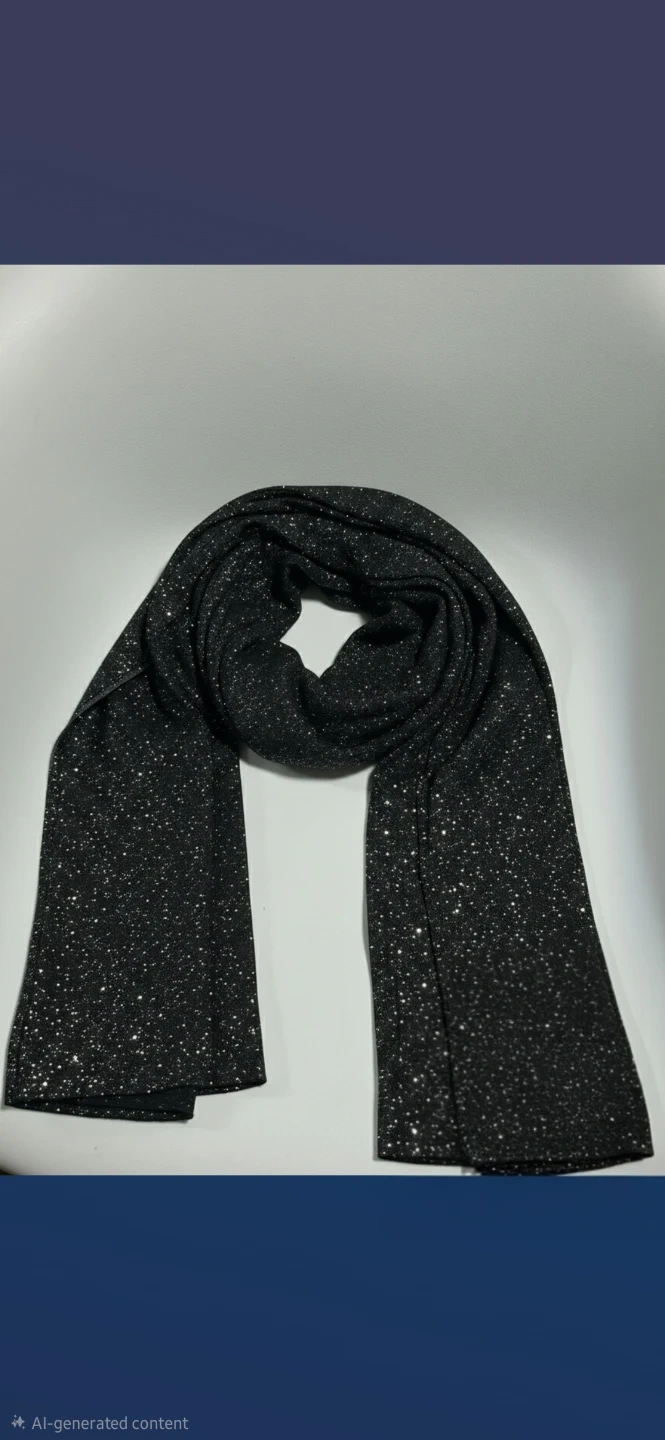 This is a shimmering black scarf with a sparkly, star-like pattern. It's made of a lightweight, sheer material, perfect for adding a touch of glamour to any outfit. The fabric feels soft against the skin.