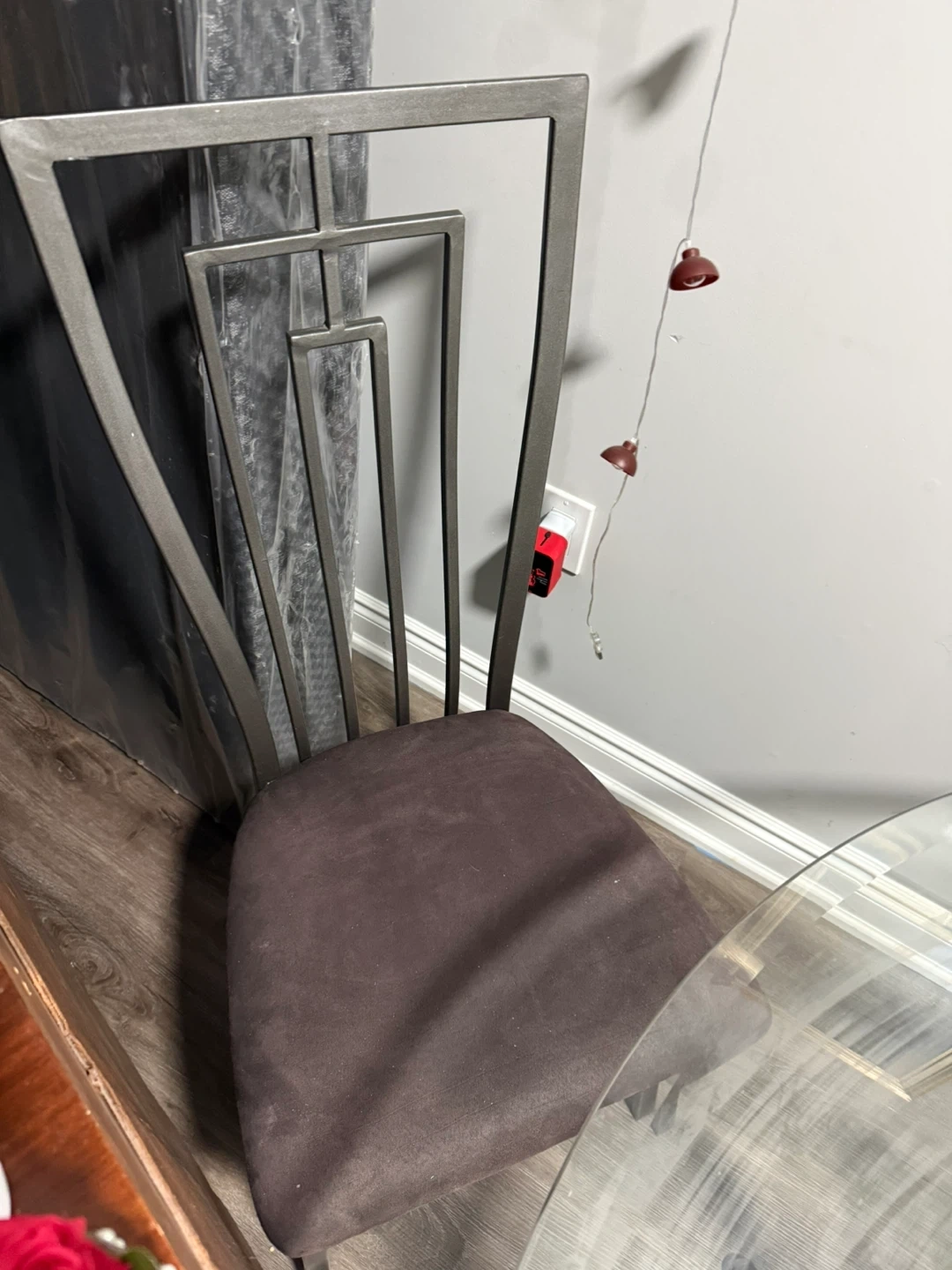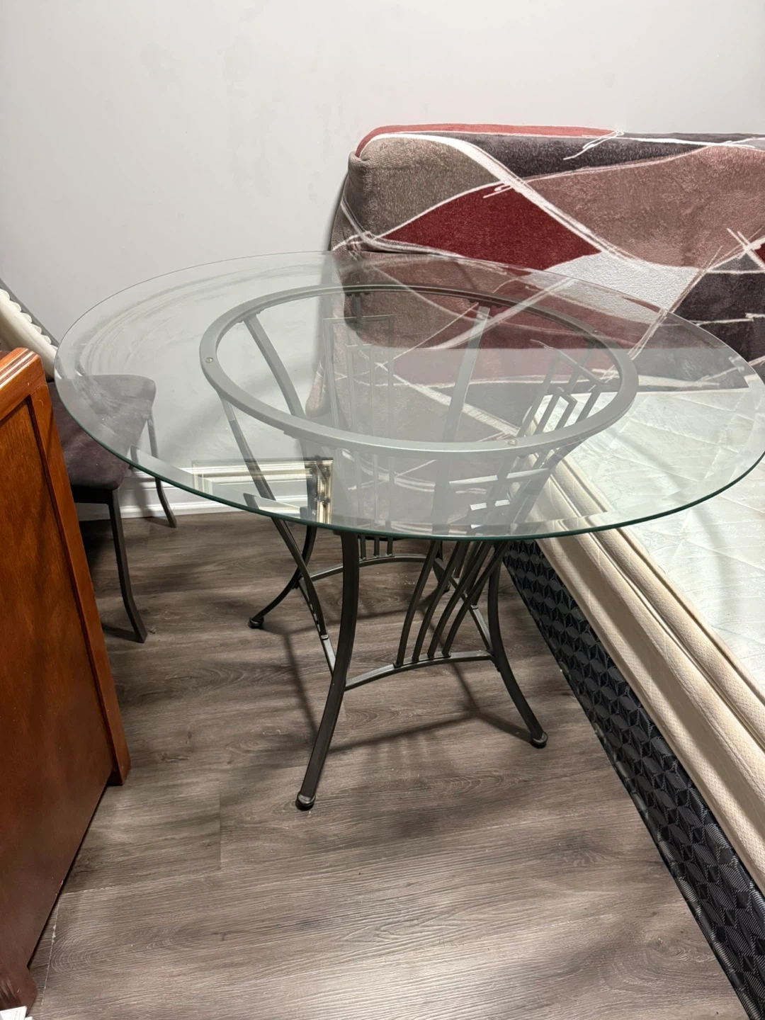 Selling a glass top dining table with two matching chairs. The table features a sleek, modern design with a metal frame. The chairs have a comfortable, upholstered seat. It's in good condition and would be a great addition to any dining space!