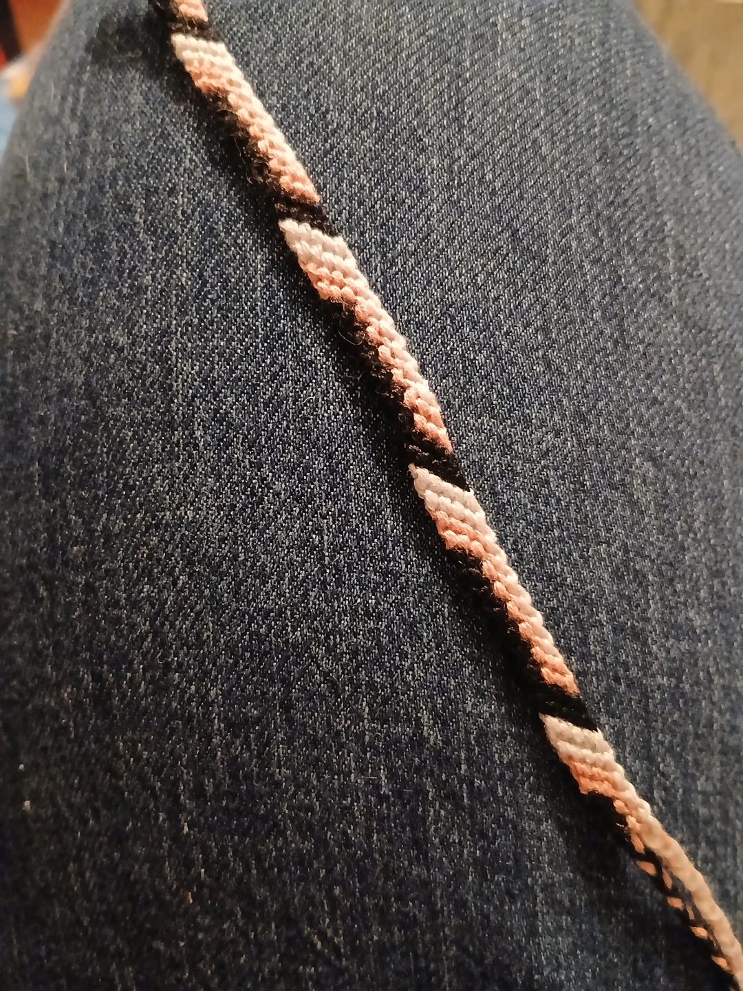 This is a handmade friendship bracelet with a diagonal stripe pattern. It features black, white, and light pink threads woven together. This bracelet would be great for adding a pop of colour to any outfit!