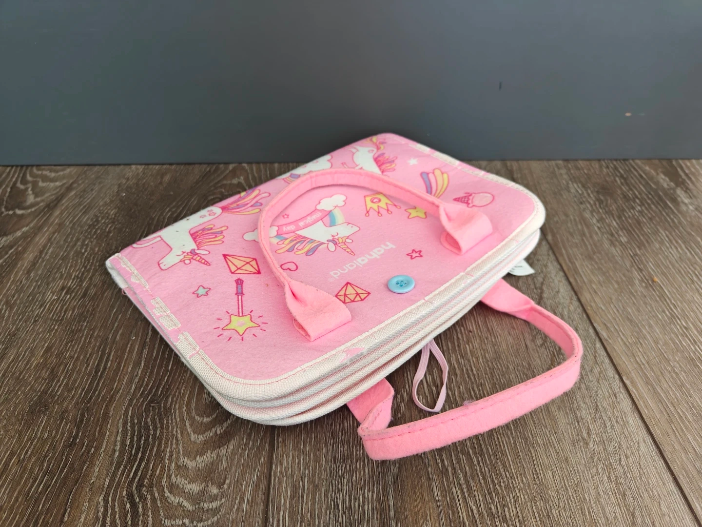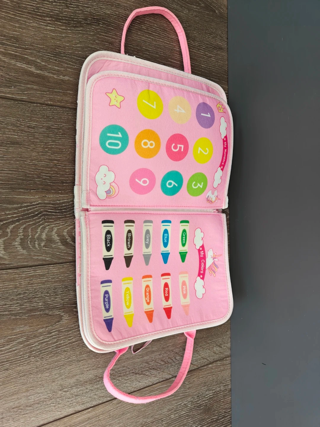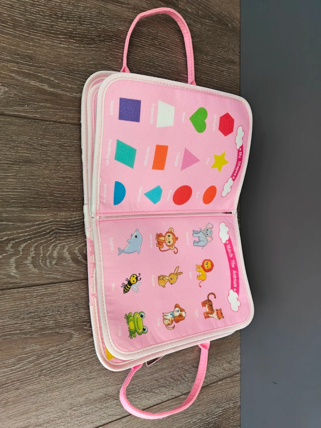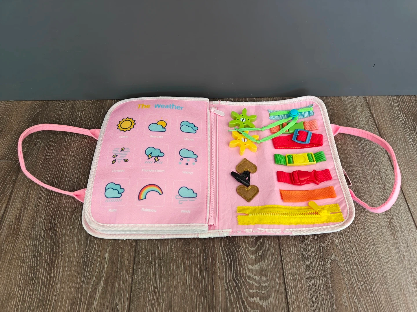 This soft activity book is designed for little ones to learn numbers, colours, shapes, weather, and the alphabet. It features buckles, zippers, and felt pieces for hands-on engagement.