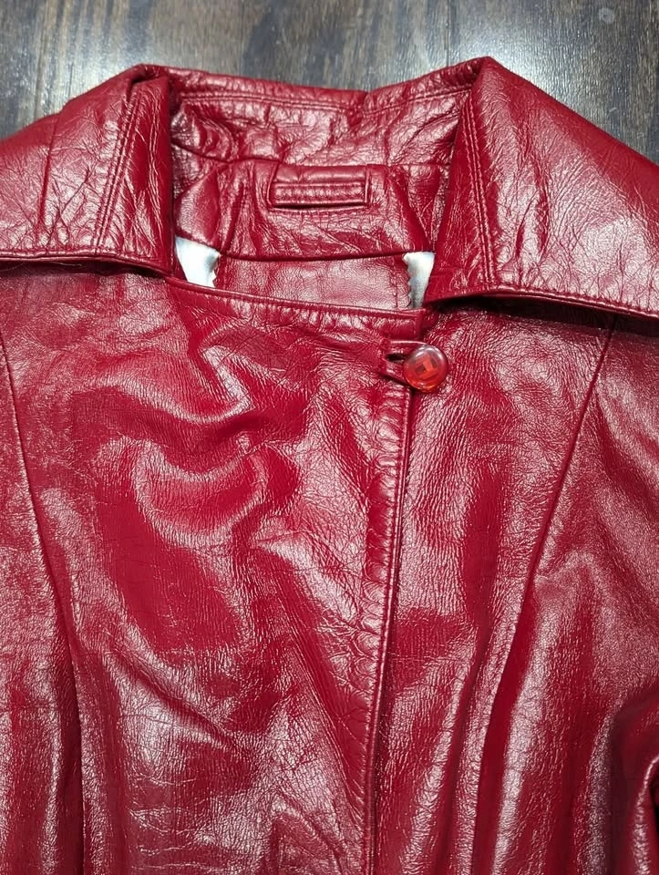 Red genuine leather trench coat