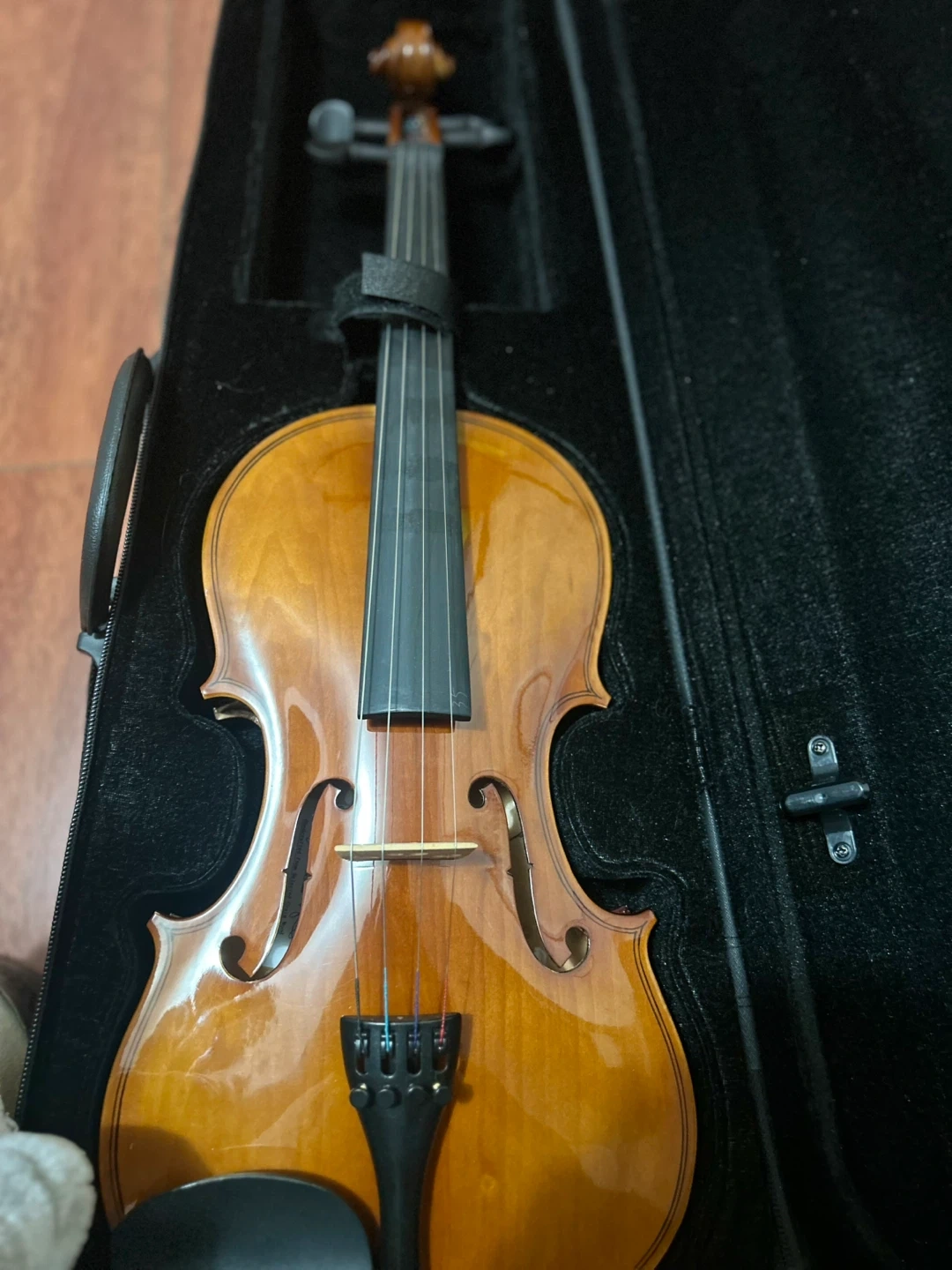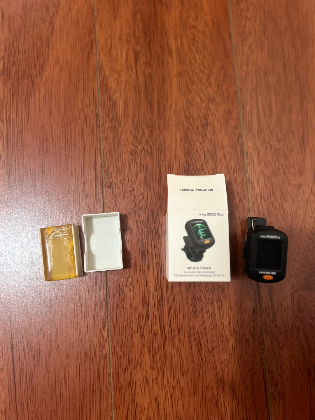 This is a violin, complete with a hard-shell case and accessories. It comes with rosin, a bow, and a clip-on tuner. The tuner's brand is MT-01A.