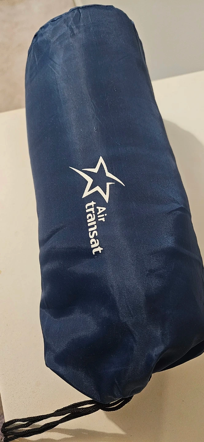 π₯ Warm Air Transat blue travel blanket, includes drawstring bag. Soft fleece material with eye cover and travelling pillow