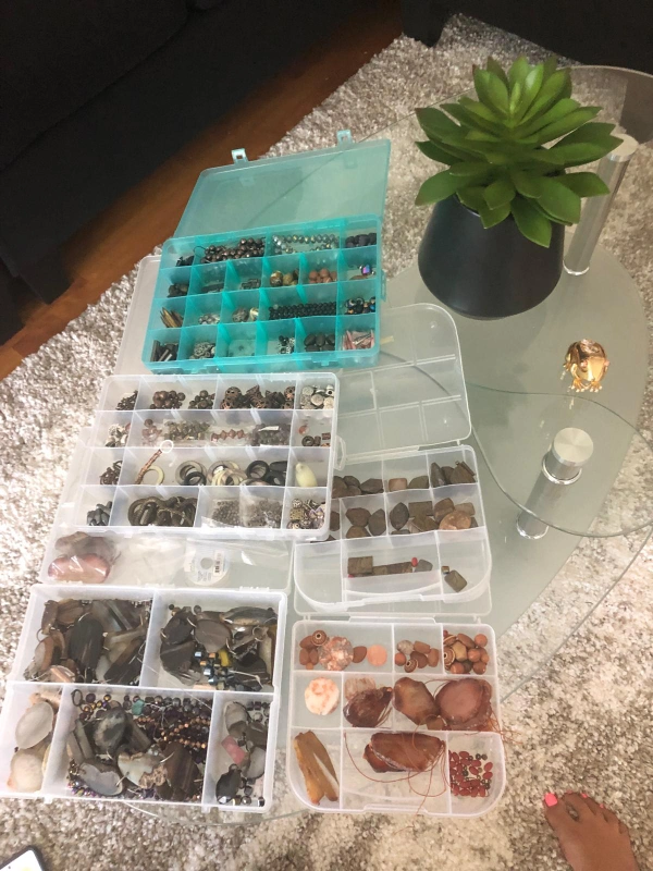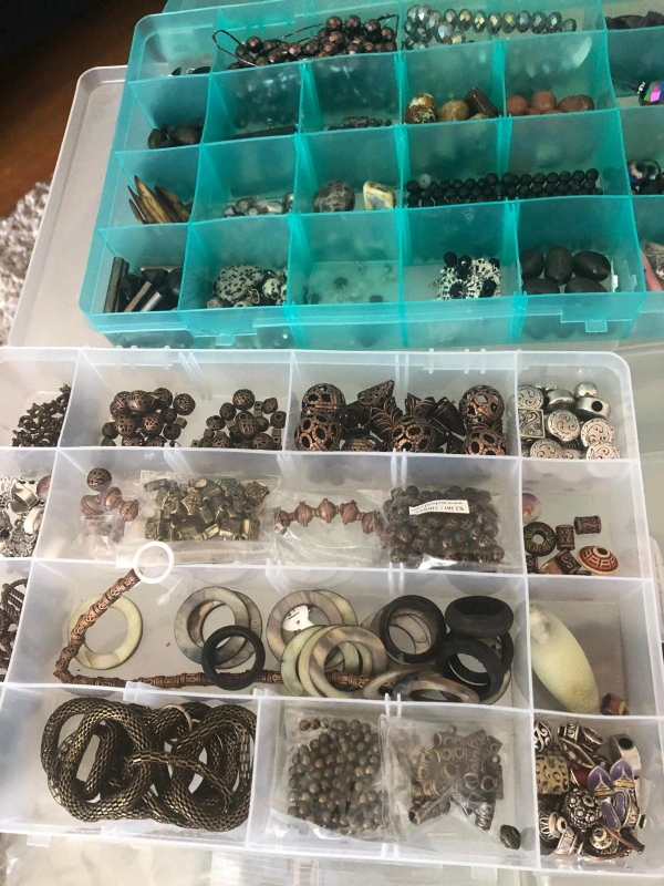 I'm selling a collection of craft beads and jewelry making supplies. There are several containers filled with a variety of beads, stones, and other components for creating your own unique jewelry pieces. Perfect for crafters and hobbyists!