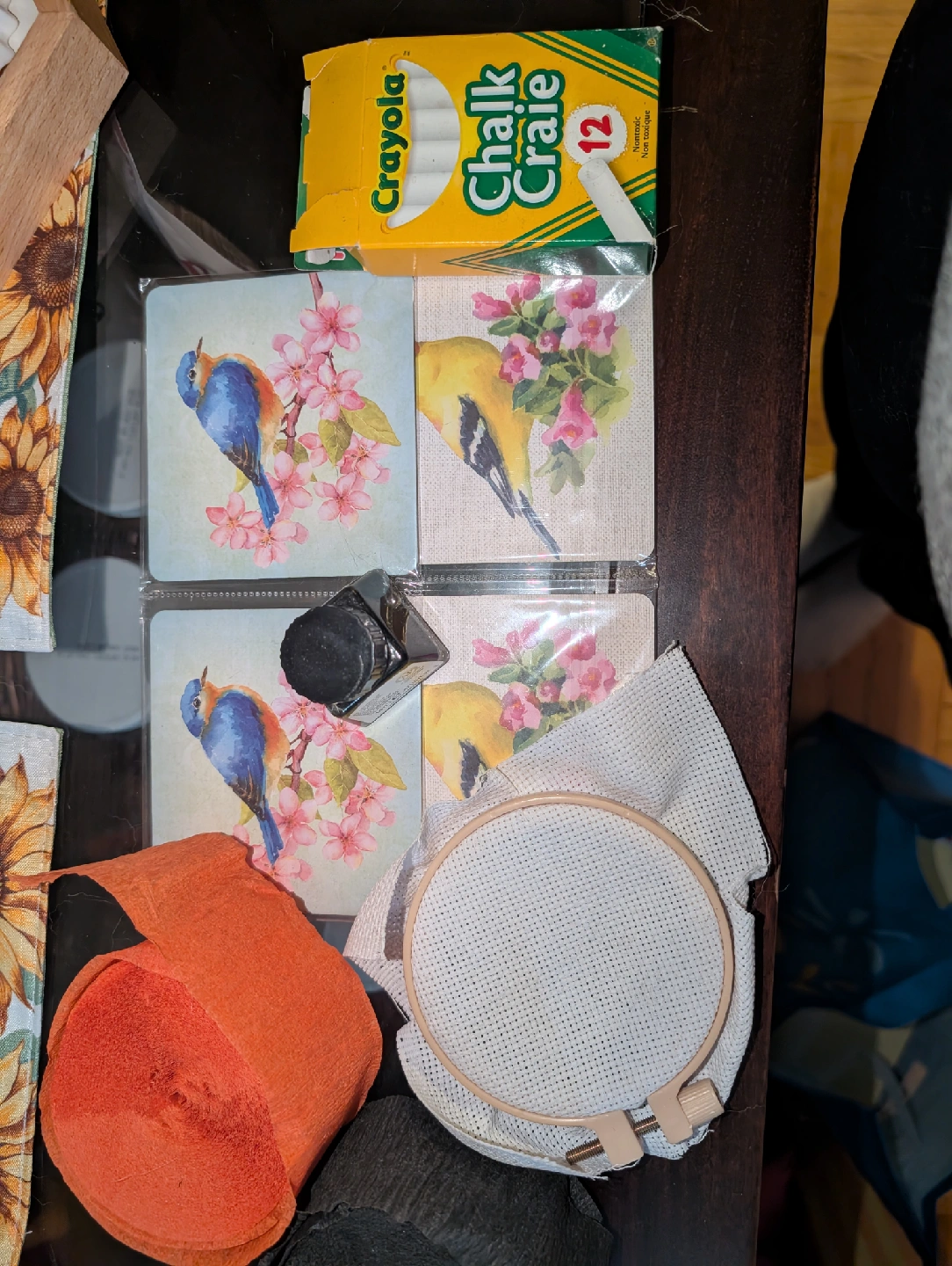 Selling a craft bundle that includes: - Four coasters with bird and floral designs - Crayola Chalk Crate with 12 pieces - Orange crepe paper roll - Embroidery hoop and fabric - Ink pad