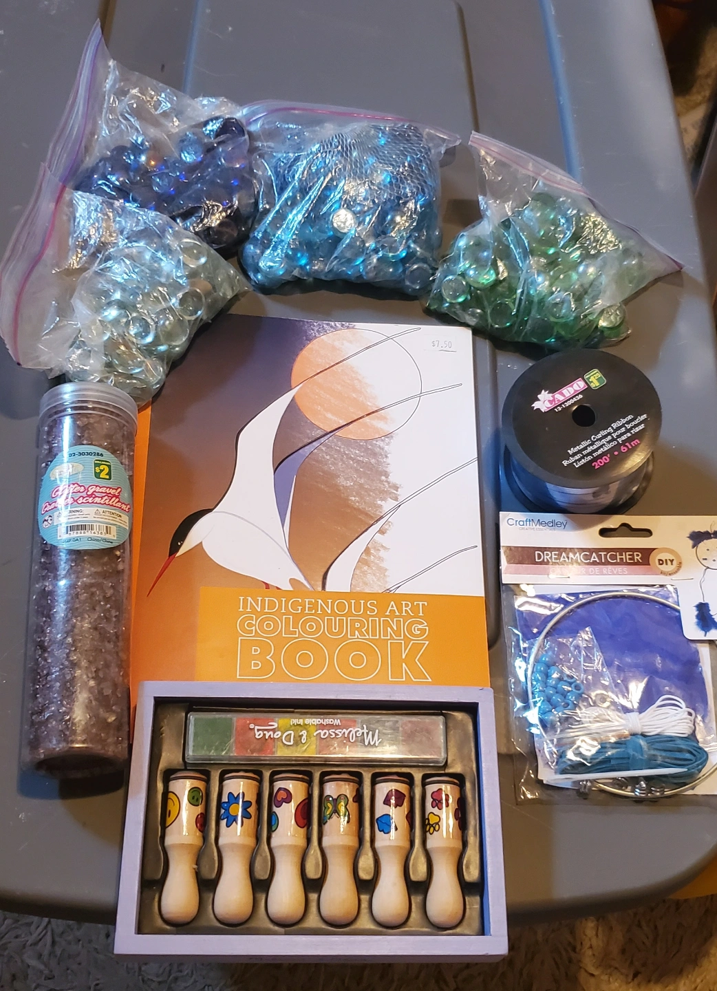 Large craft bundle includes various coloured glass beads, a colouring book, metallic ribbon, dreamcatcher kit, small stamps and more. Perfect for creative projects. $10 for entire craft bundle pick up only