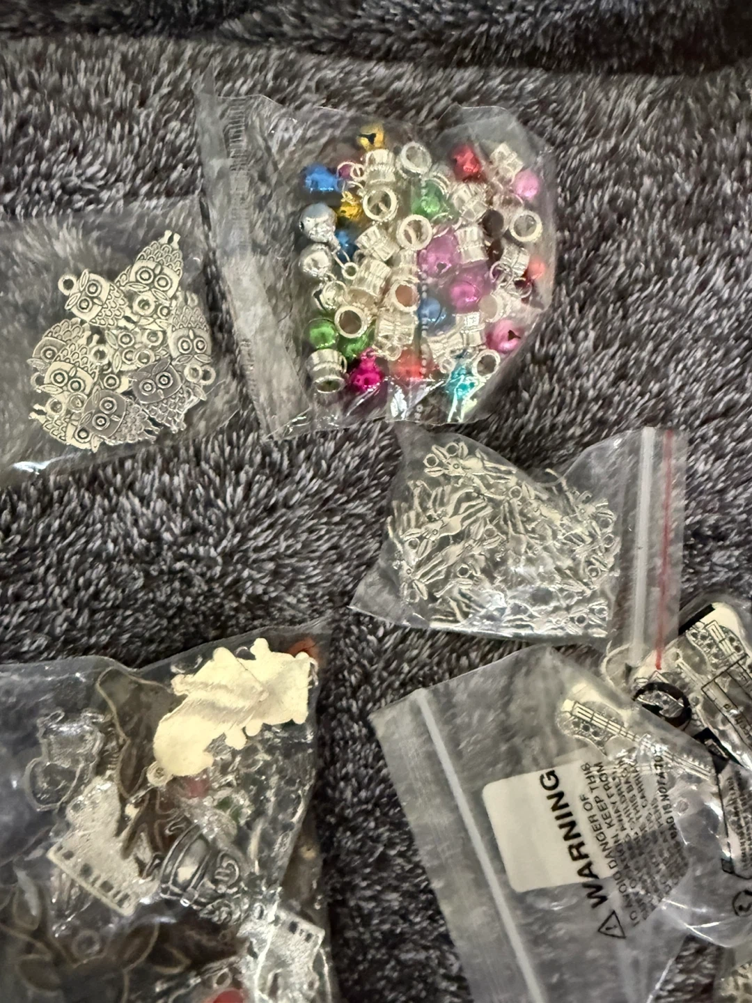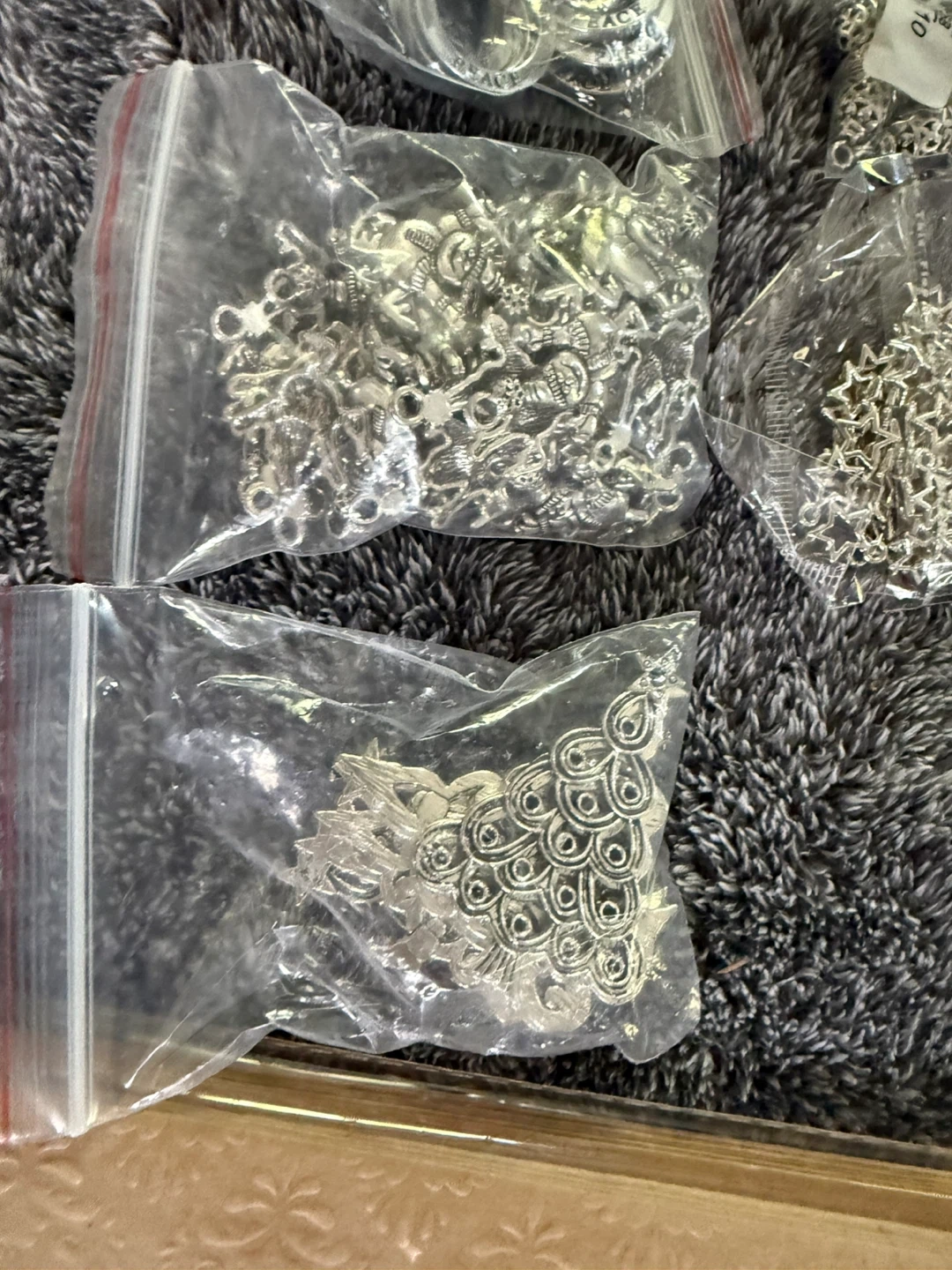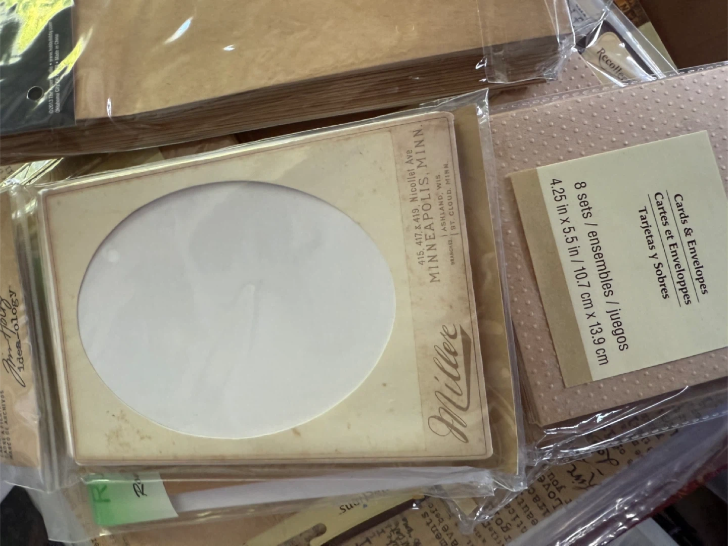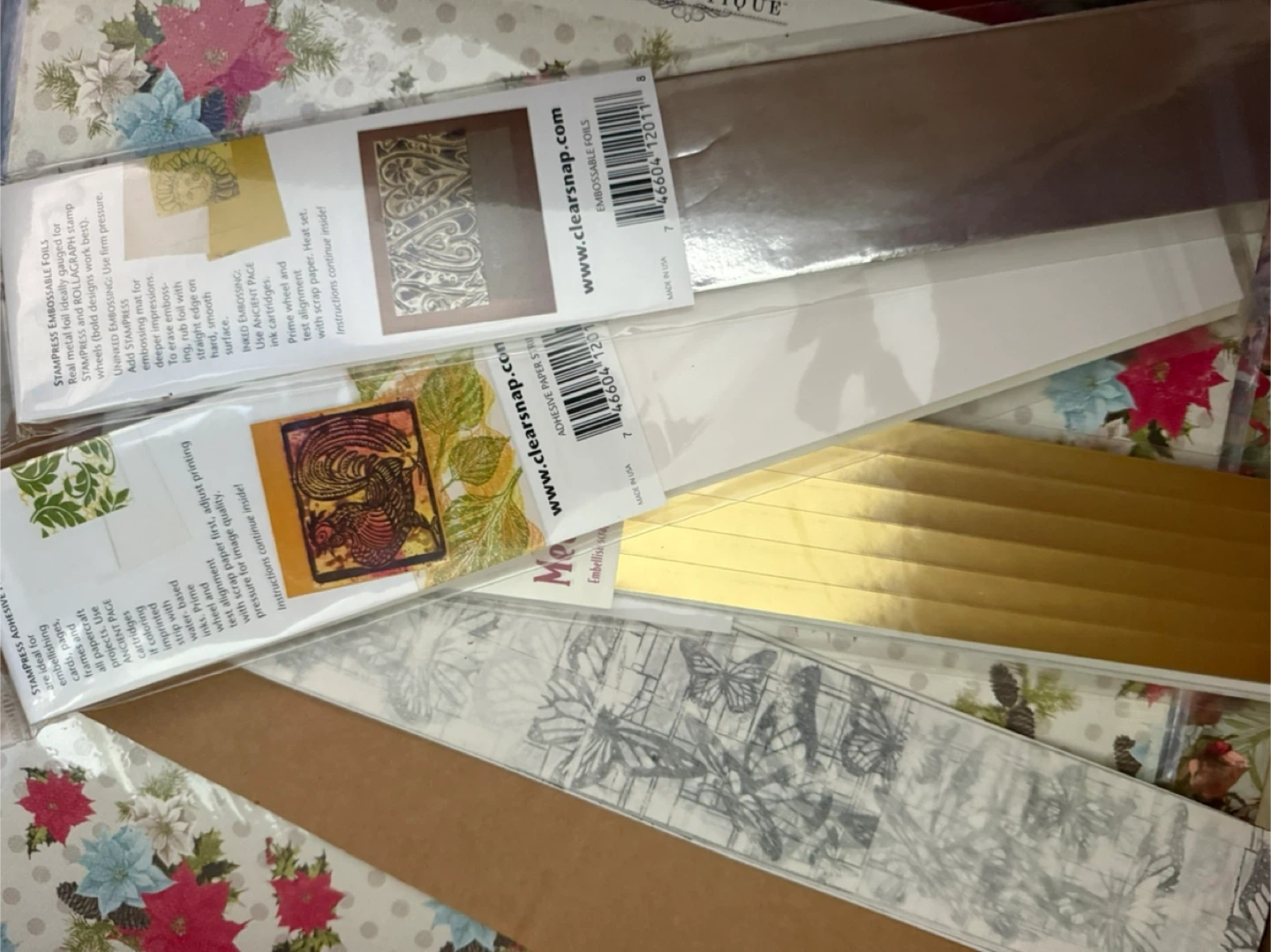 Selling a bundle of craft supplies including ClearSnap embossable foil and shadow paper, Miller cards and envelopes (8 sets, 4.25 in x 5.5 in / 10.7 cm x 13.9 cm), and various charms and embellishments
