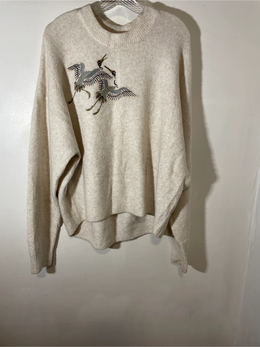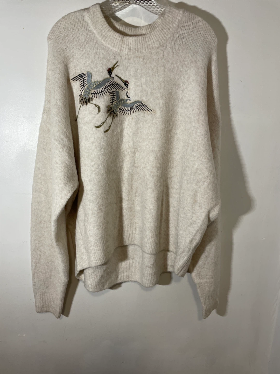 Cozy knit sweater featuring beautiful crane embroidery! It's a soft, neutral colour, perfect for layering or wearing on its own. Great for adding a touch of elegance to any outfit