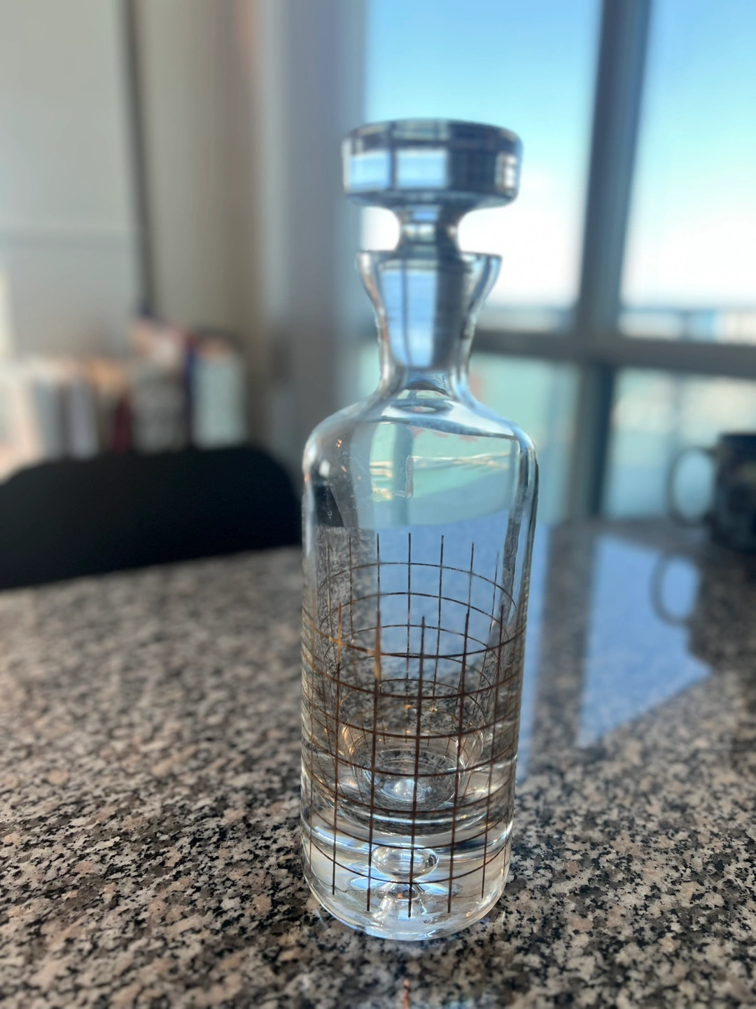 304Glass decanter with gold detailing. Features a grid pattern around the body. Almost new. Perfect for serving liquor. Pick up only.