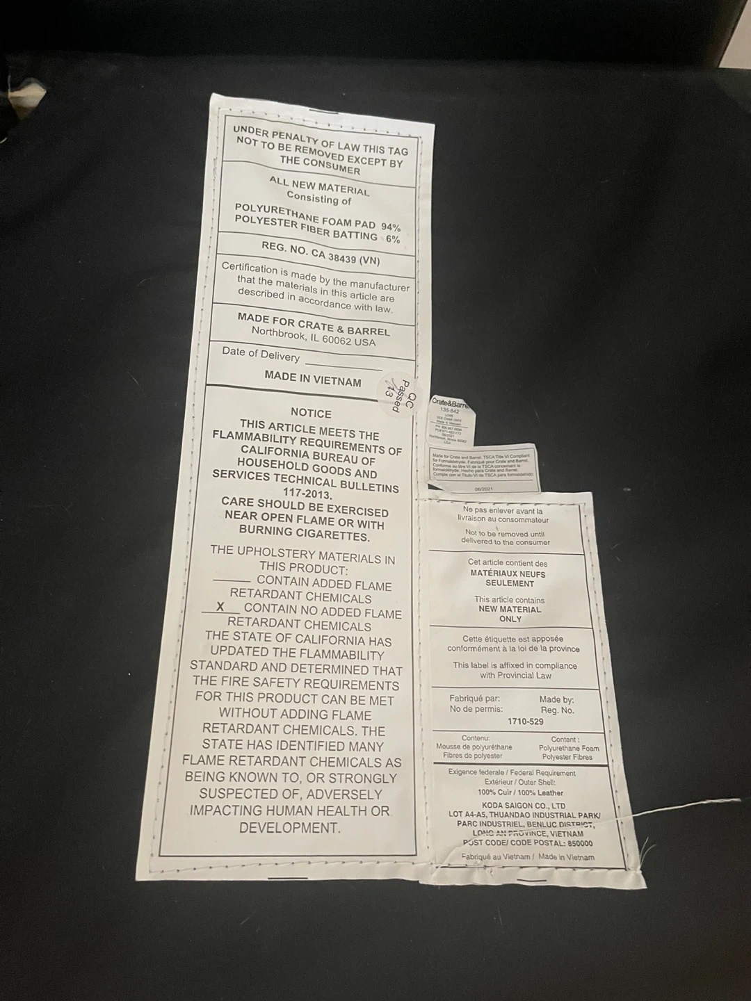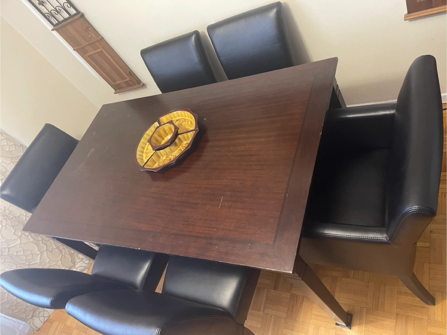 Selling a dining table set from Crate & Barrel, complete with six chairs. The chairs are upholstered with what feels like a leather-like material, and the table has a dark wood finish. The set is in good condition and ready to find a new home!
