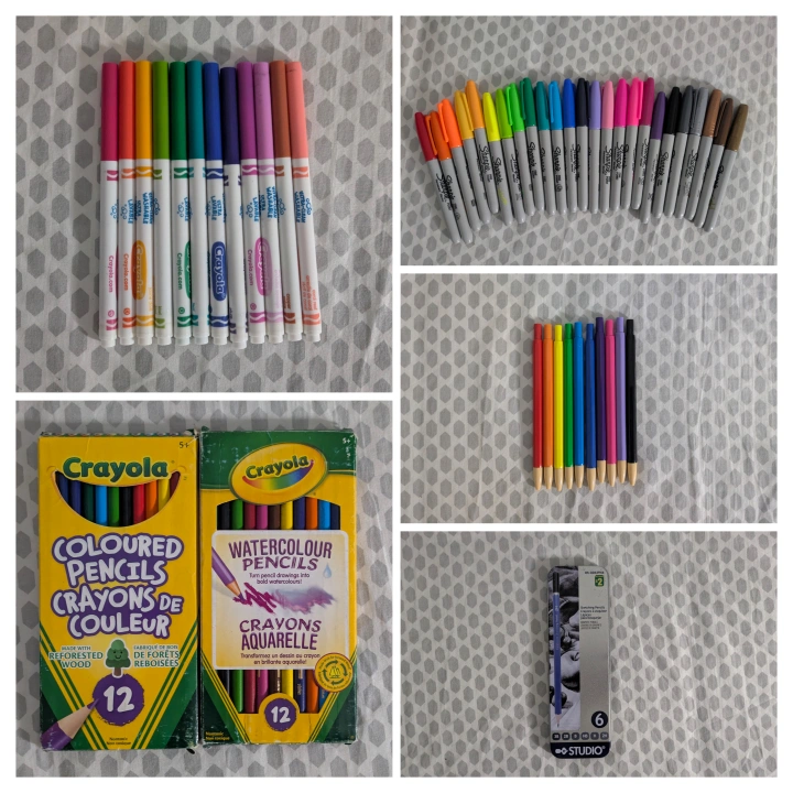 42Selling a variety of art supplies: - Set of Sharpie markers (25 pack) - Crayola thin markers (12 pack) - Color Lead Pencils (10 pack) - Crayola Coloured Pencils (12 pack) - Crayola Watercolour Pencils (12 pack) - Studio Sketching Pencils (6 pack) ALL FOR 20$
