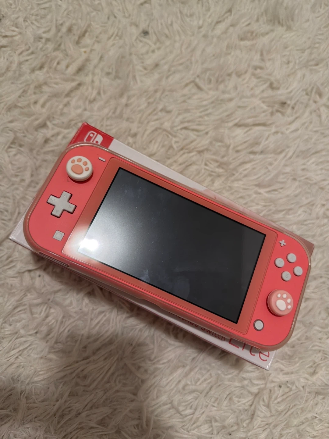 Coral coloured Nintendo Switch Lite. It's a compact and portable console for gaming on the go. Includes the original box and packaging.