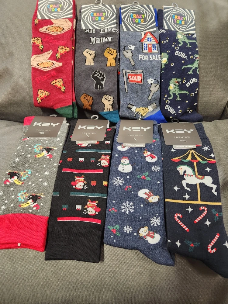 39Here's a fun assortment of socks from Crazy Toes and Key! There are various patterns and designs, perfect for adding a bit of personality to your outfit. All socks are in Brand New condition and ready for a new home $5 each or 3 pairs for $10 While supplies Last Pick up Brampton L6y4y5 area Queen and Chinguacousy rd