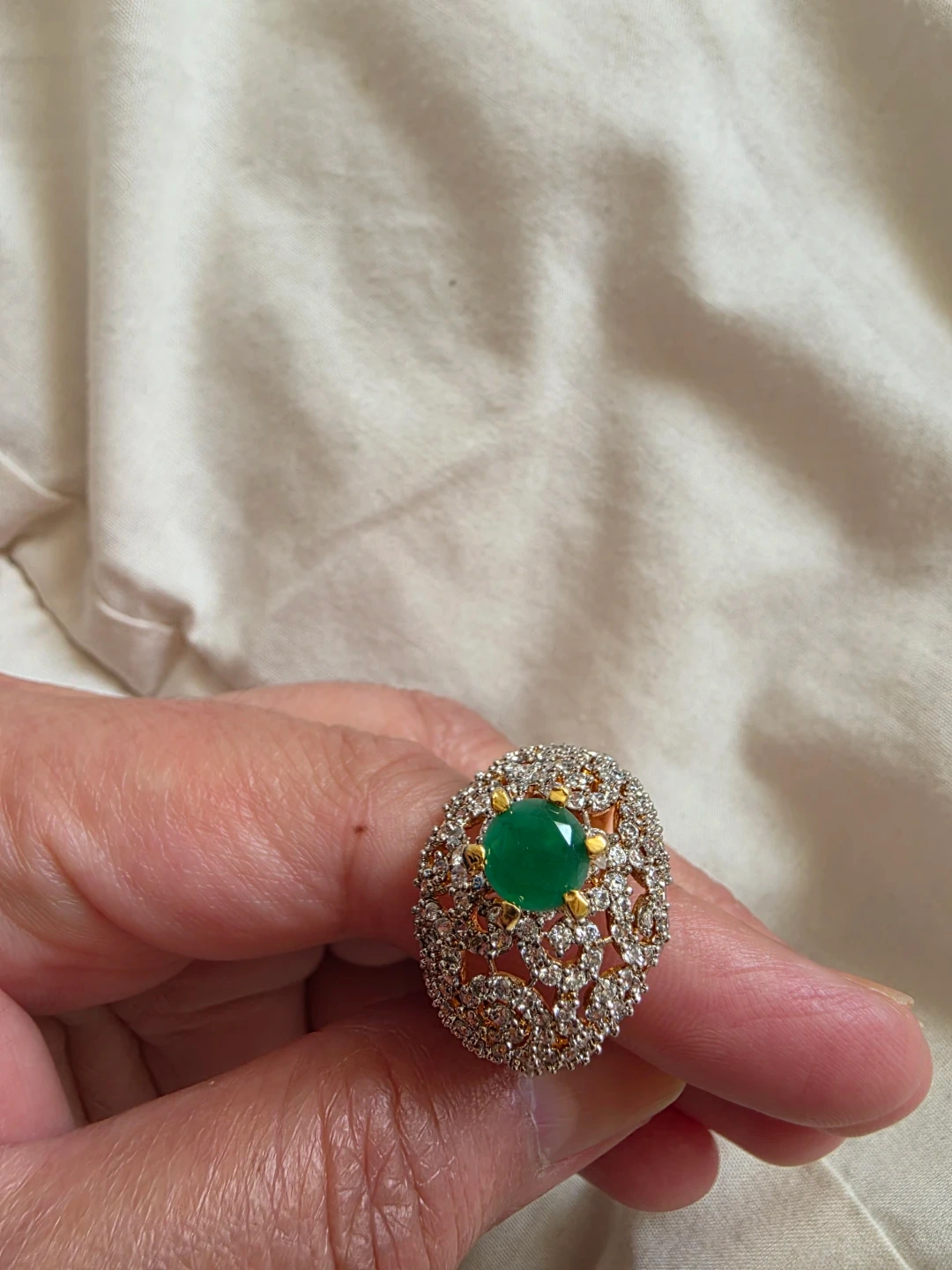 This ring features a stunning central emerald surrounded by sparkling diamonds. The intricate detailing on the band adds a touch of elegance. It's a beautiful piece for any occasion!