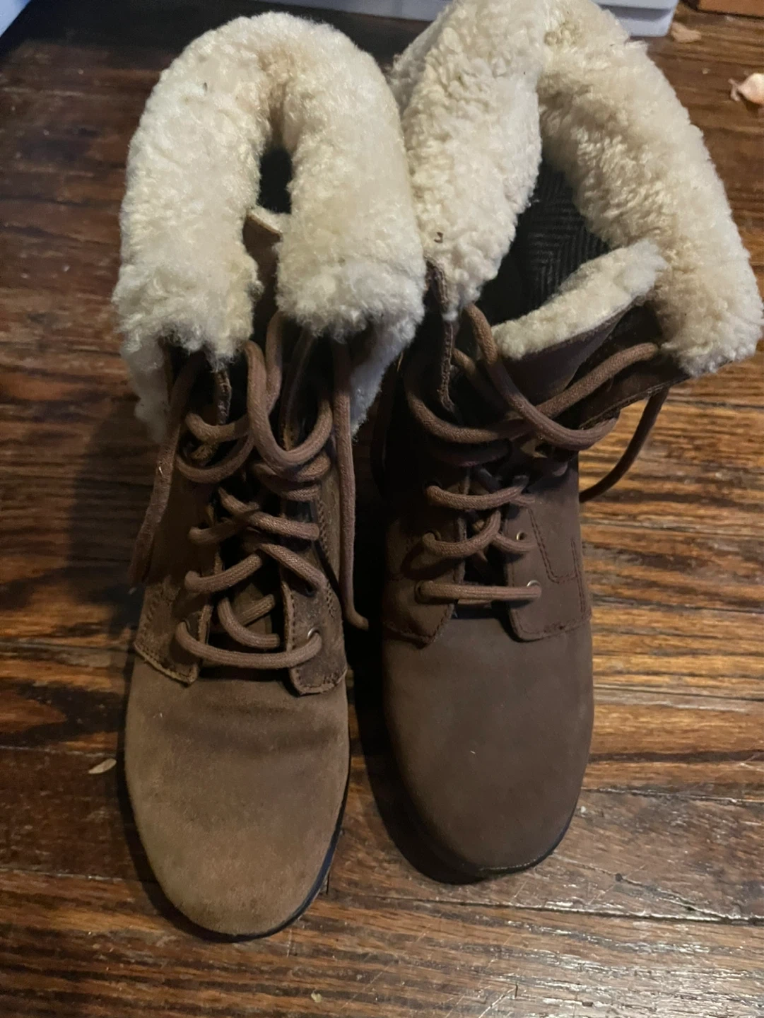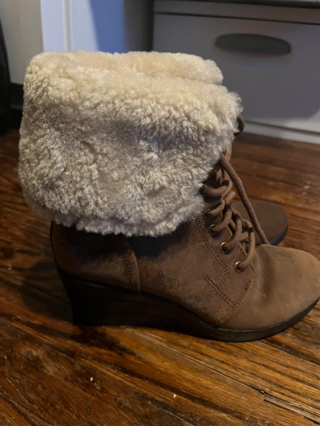 Warm and stylish brown suede wedge boots by Ugg. They feature a cozy shearling trim and lace-up closure. Perfect for keeping your feet toasty during colder weather!