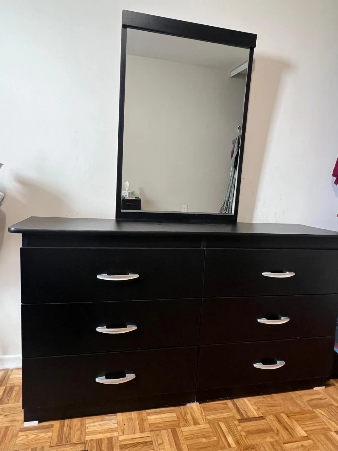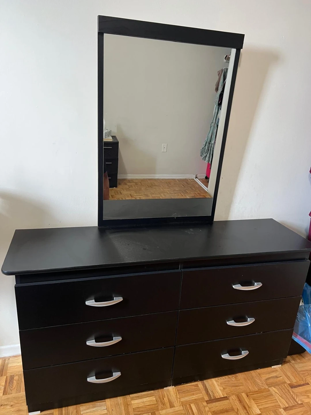Black 6-drawer dresser with a matching mirror. It has silver drawer pulls. This dresser provides ample storage for your bedroom. It's a solid piece for organizing clothes and accessories.