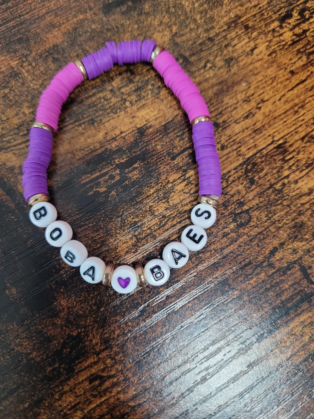 This bracelet features colourful purple and pink disc beads with white letter beads spelling "BOBA BAES" and a purple heart accent. It's stretchy for an easy fit. A fun accessory for boba lovers!