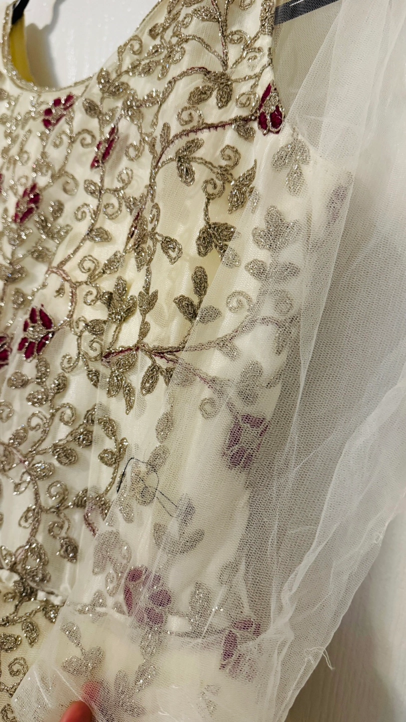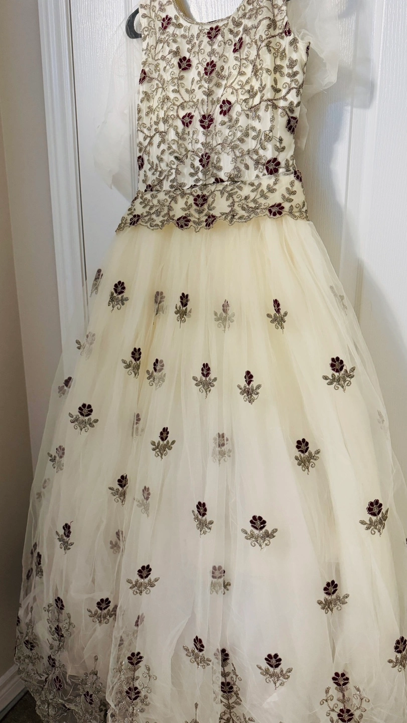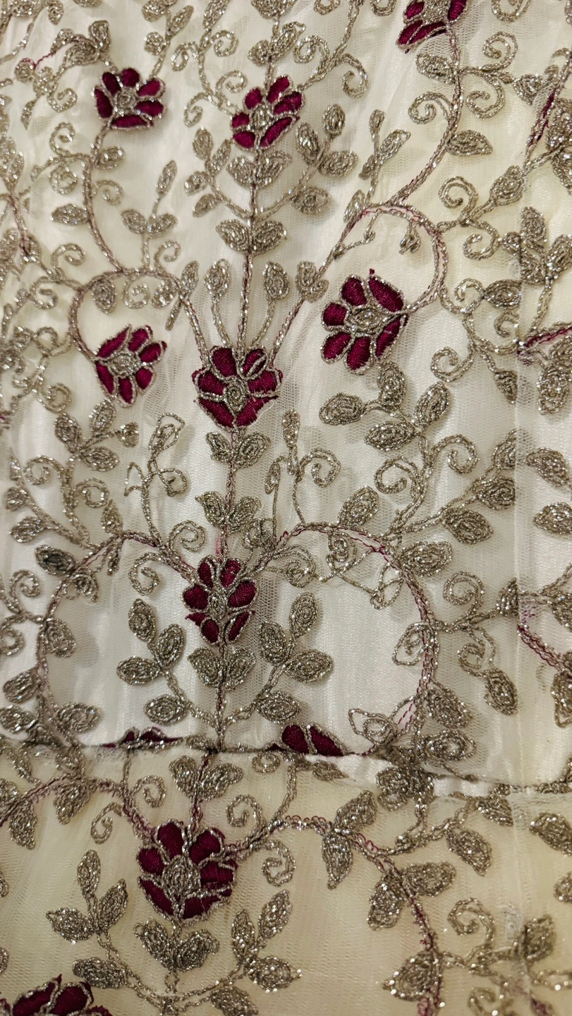 5Cream coloured dress with burgundy and silver embroidery. Sleeveless with sheer sleeves attached. Fitted bodice and full skirt.