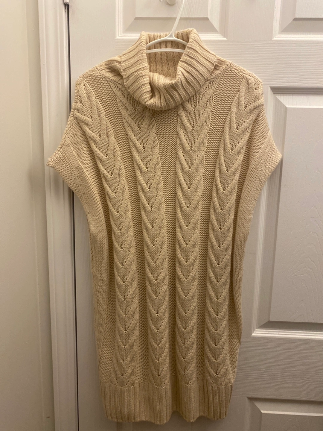 363Cream-coloured, short-sleeved tunic sweater. Features a high turtleneck and cable knit detailing. Relaxed fit. Perfect for layering.