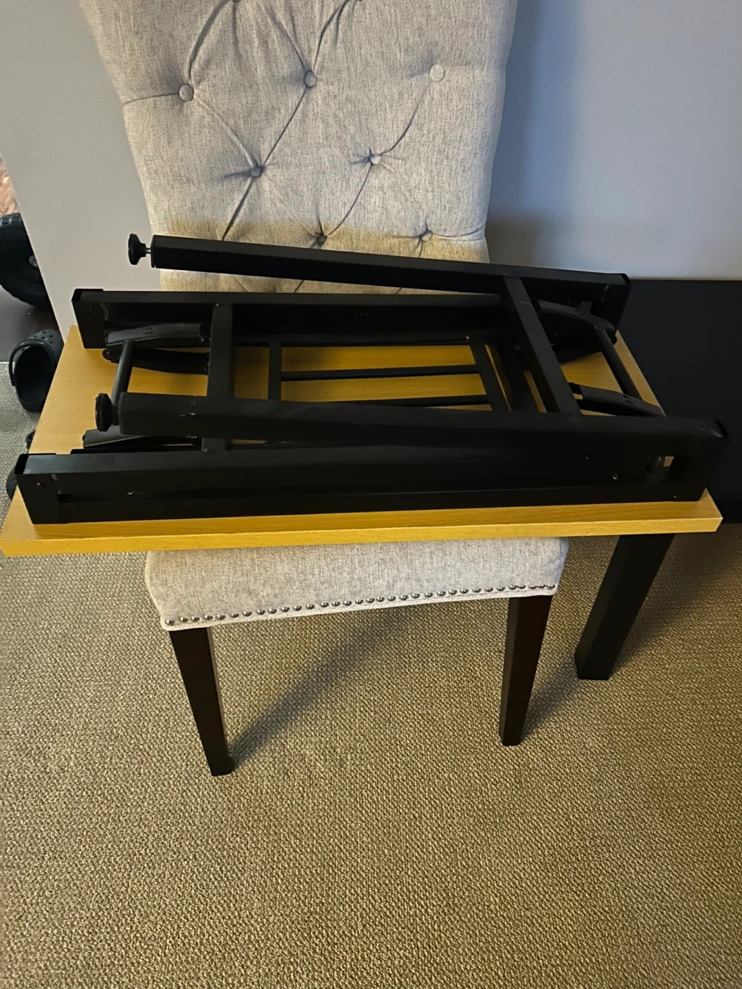 65Selling a handy cream coloured folding table! It's in great shape and perfect for small spaces or when you need an extra surface. Folds up easily for storage- fits conveniently 3 monitors, 2 keyboards and some.