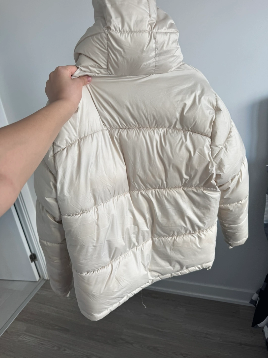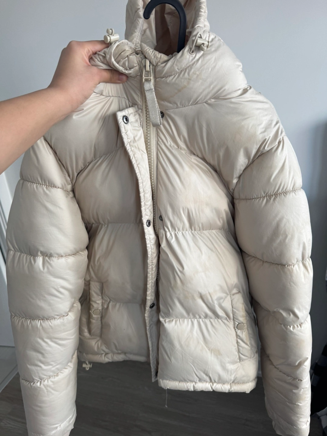 90Warm and cozy puffer jacket. Features a hood and zipper closure. Excellent for colder weather. Lightweight and easy to wear.