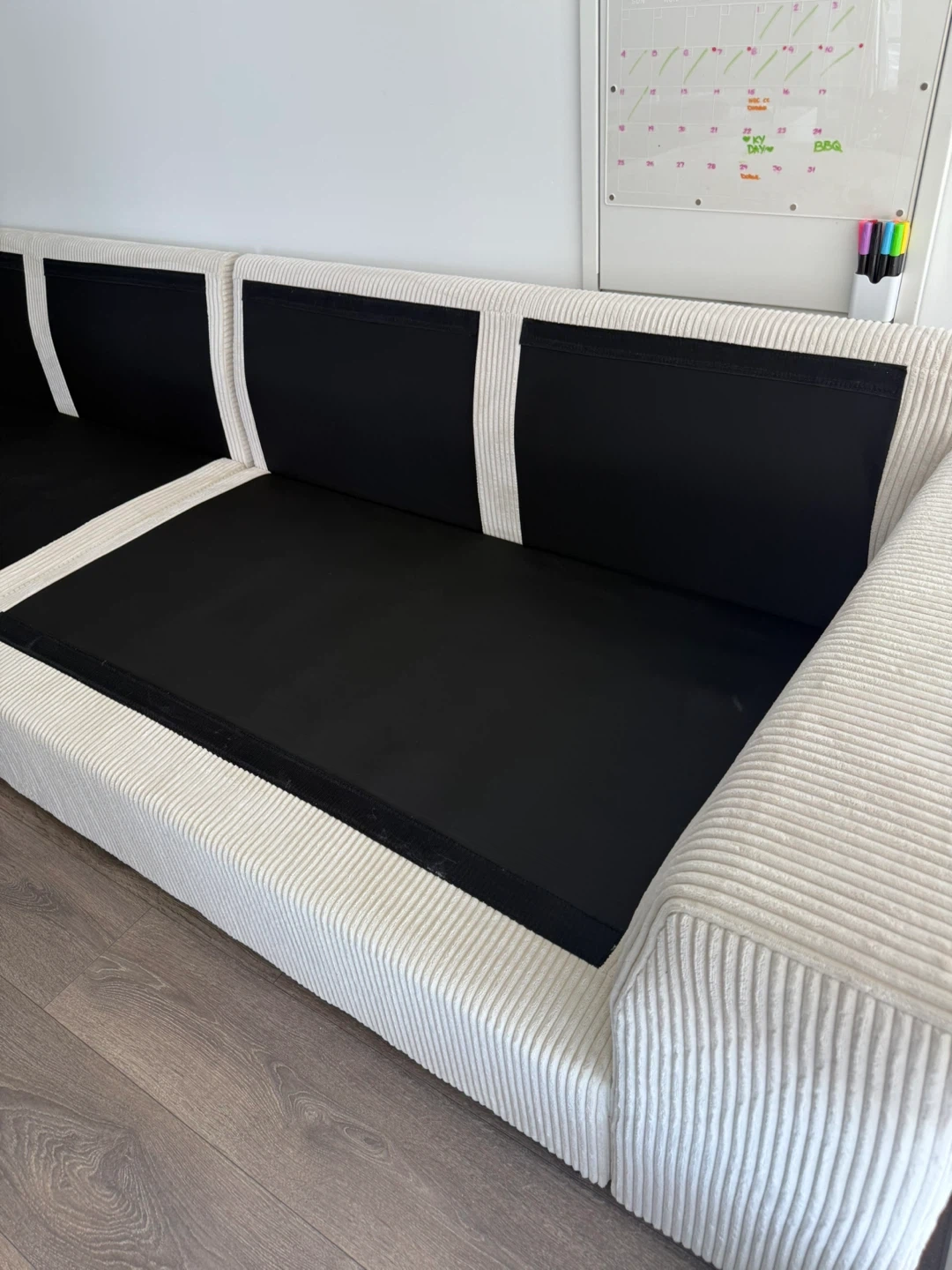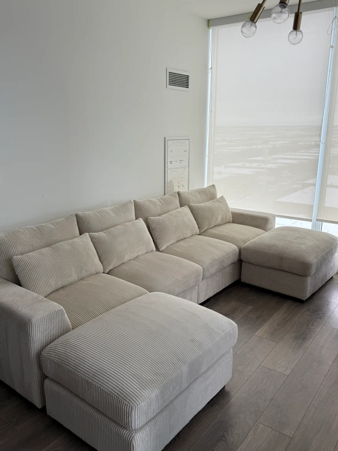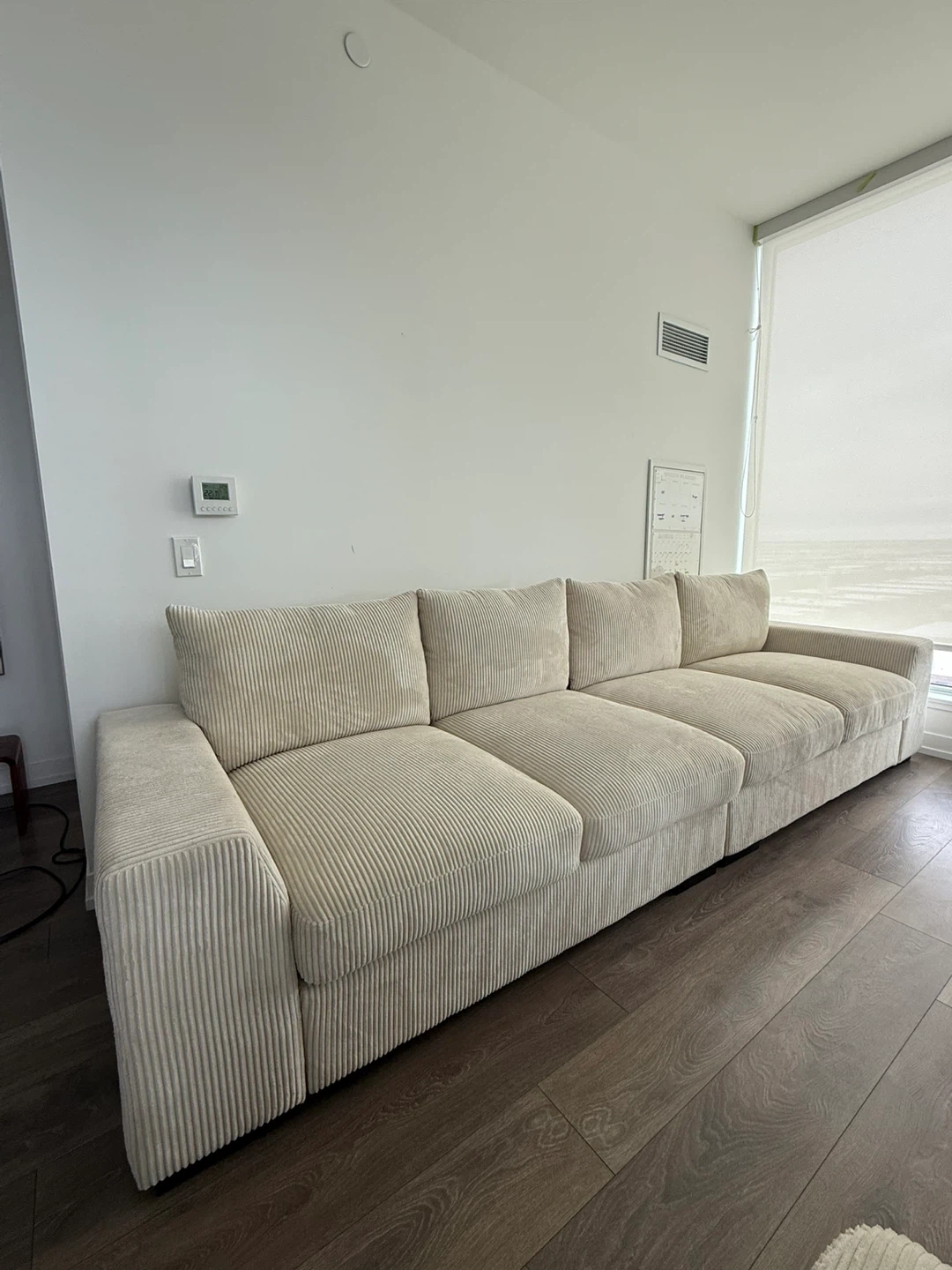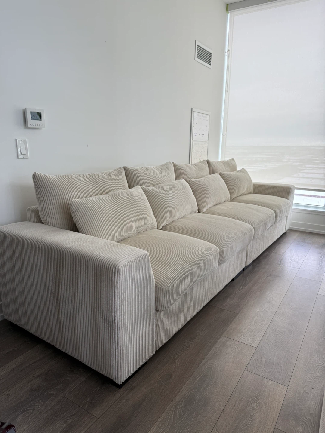 65Bought Sept 2025 from Wayfair and still basically brand new. This cream corduroy sectional is super comfy, stylish, and ridiculously versatile. It’s modular, so it comes apart and goes back together super easily... perfect if you ever need to move it or get it through tight doorways. You can use it as a long couch or pull it together for a cozy movie night setup. Comes with two ottomans and four matching throw pillows for extra seating or lounging however you want. The fabric is soft, plush, and durable, and the neutral cream fits with basically any décor. Selling because I’m switching to a darker color that works better for my space. 34.25”H x 123.25”Lx 37.8”D Pickup near Highway 7 & Jane. Serious inquiries only.