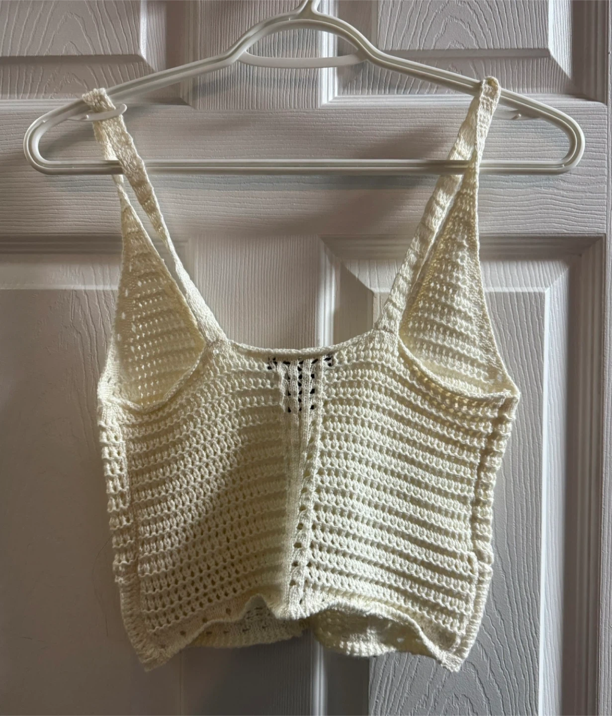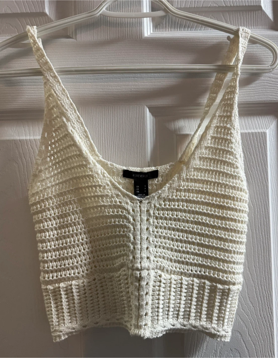71Selling a cute cream-coloured crochet tank top from Forever 21 in size small! It's in great condition and perfect for layering or wearing on its own during warmer weather. The material is lightweight and breathable, making it super comfy.