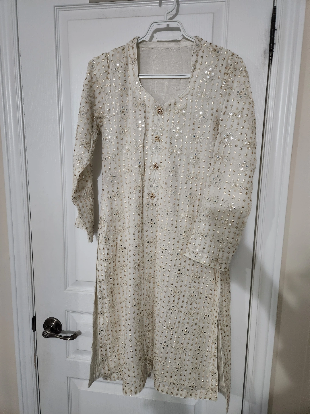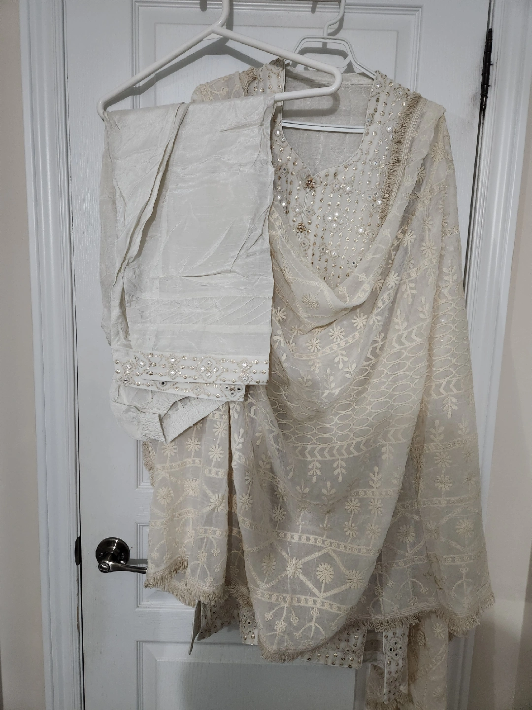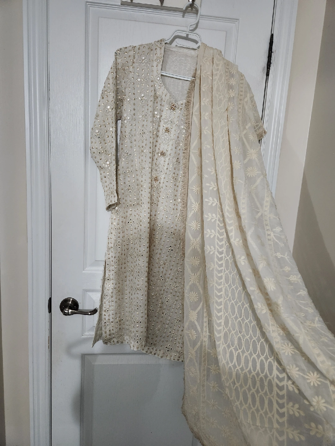 10Selling a beautiful cream-coloured shalwar kameez. This outfit features intricate embroidery and detailing. Perfect for a special occasion or festive event!