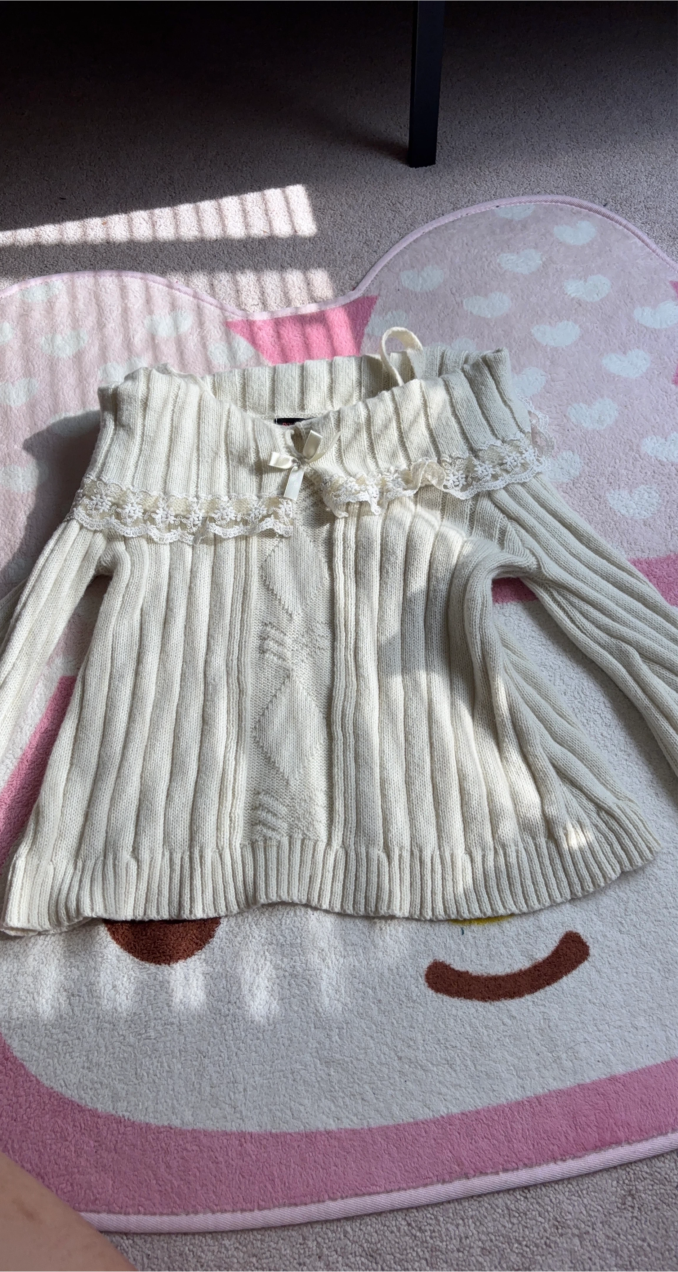 A super cute cream-coloured knit sweater! It features a lovely lace trim around the neckline and a delicate bow detail. Perfect for layering or wearing on its own for a sweet, cozy look I wore it a lot but sadly doesn’t fit, I’ll give away for cheap lwk