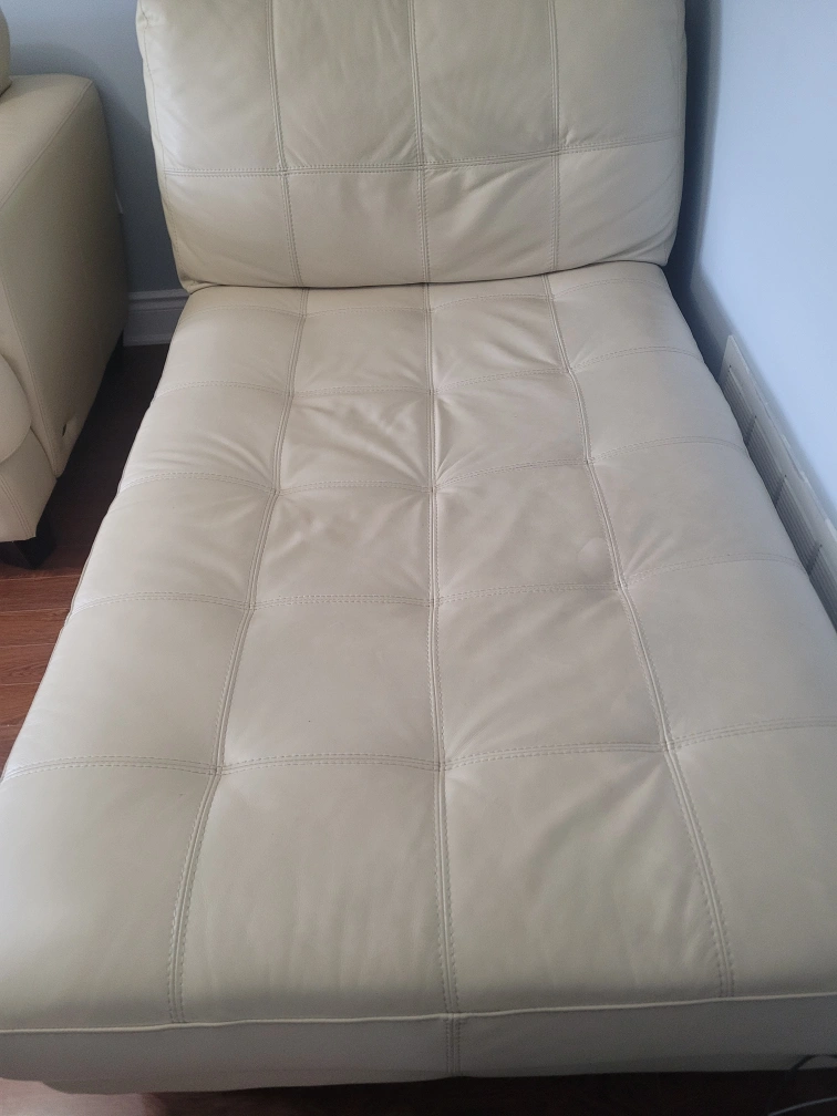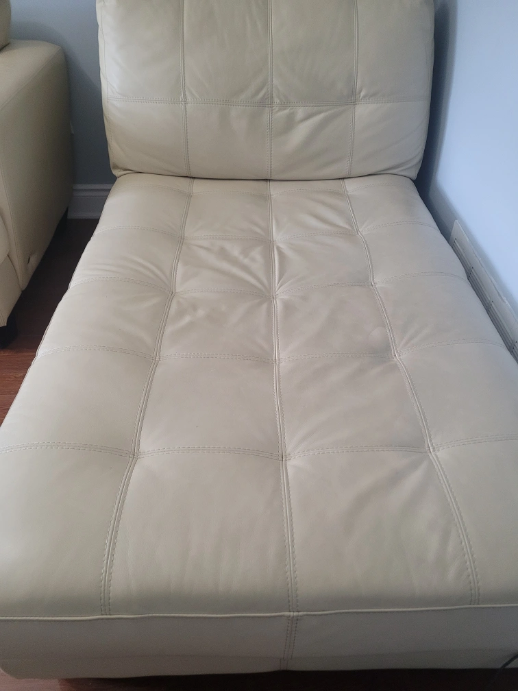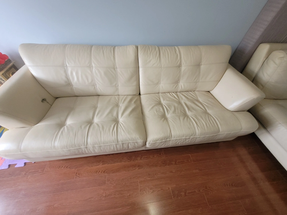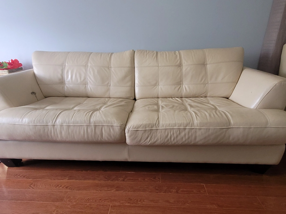 10Selling a comfortable cream-coloured leather sofa with a chaise lounge! It's in good condition and would be a great addition to any living room. Perfect for relaxing and adding a touch of elegance to your space