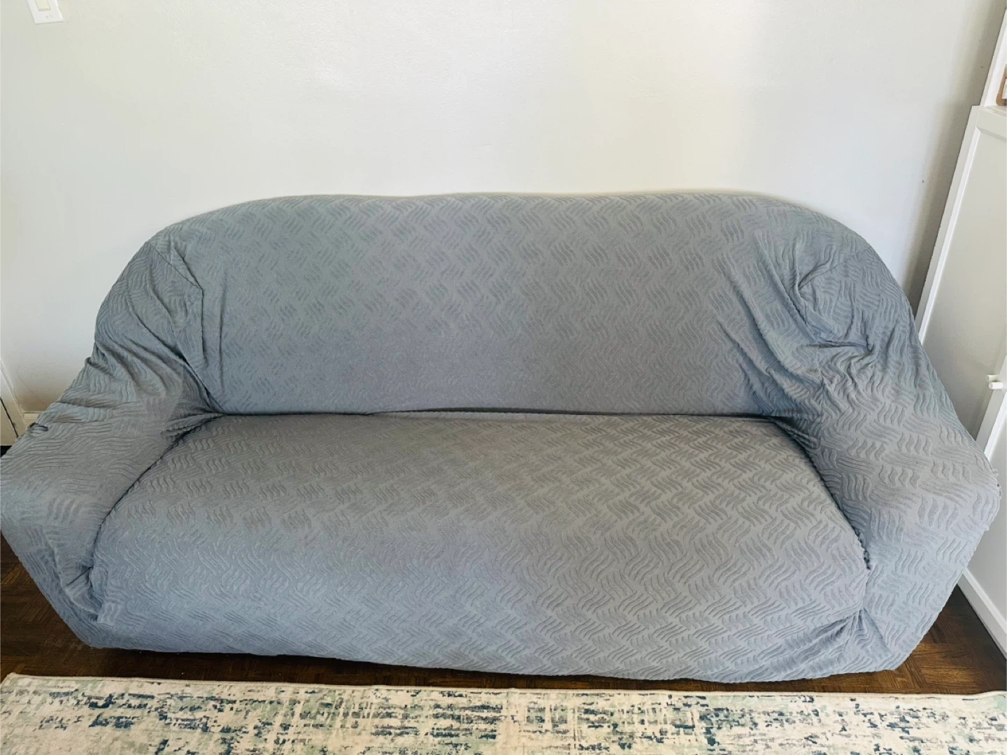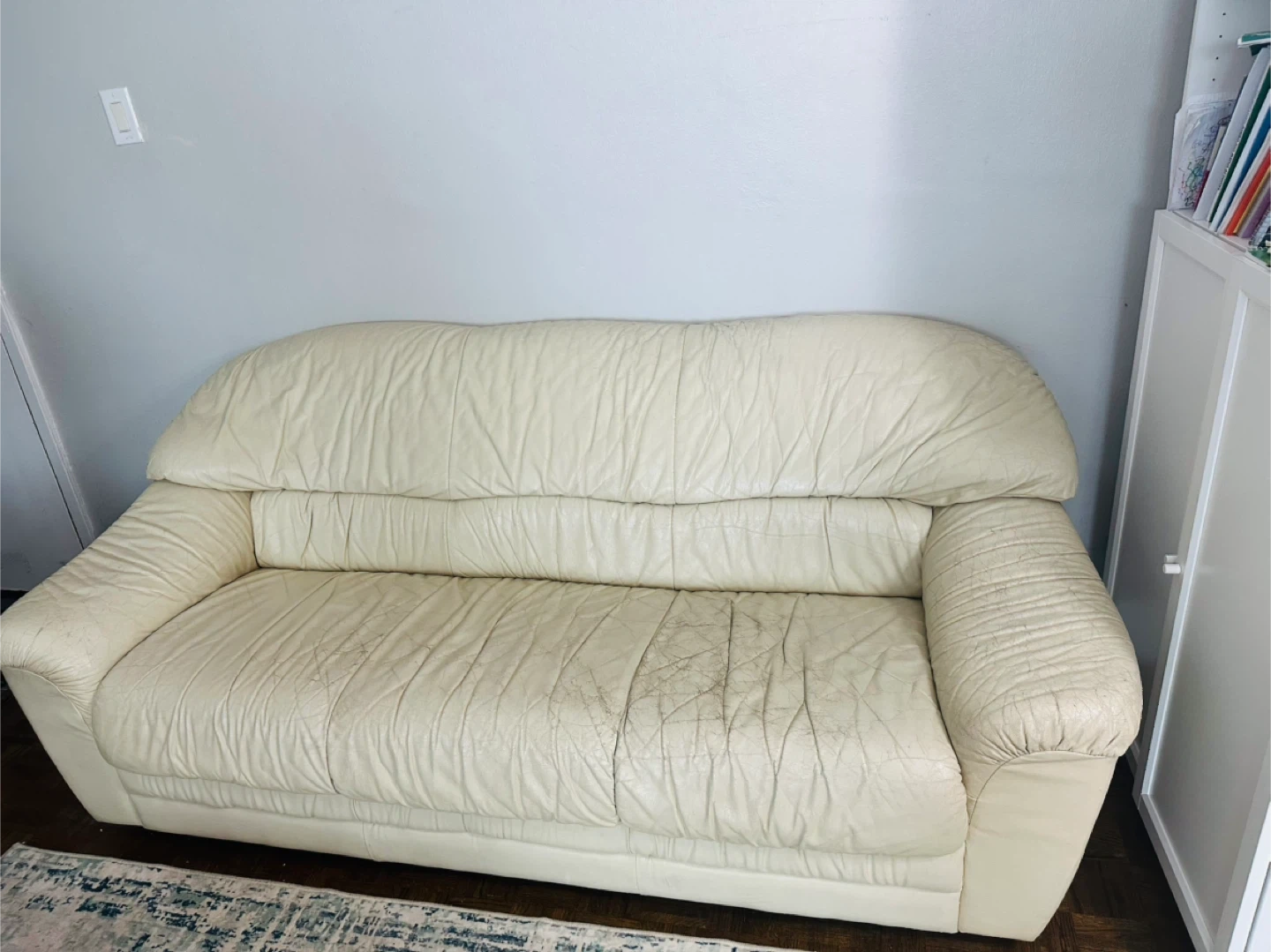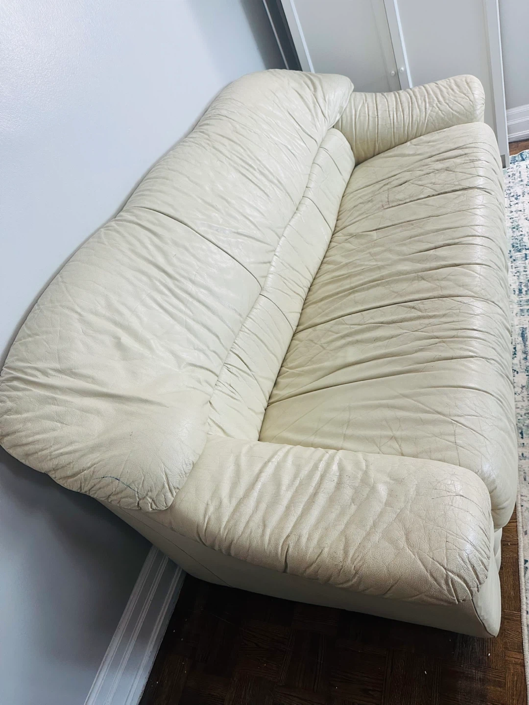 I'm selling a cream-coloured leather sofa. It shows some signs of wear, but could be a great addition to a living room or den. The sofa is covered with a gray patterned fabric cover in one of the photos. 2 sets of sofa cover included Smoke free pet free home No delivery available