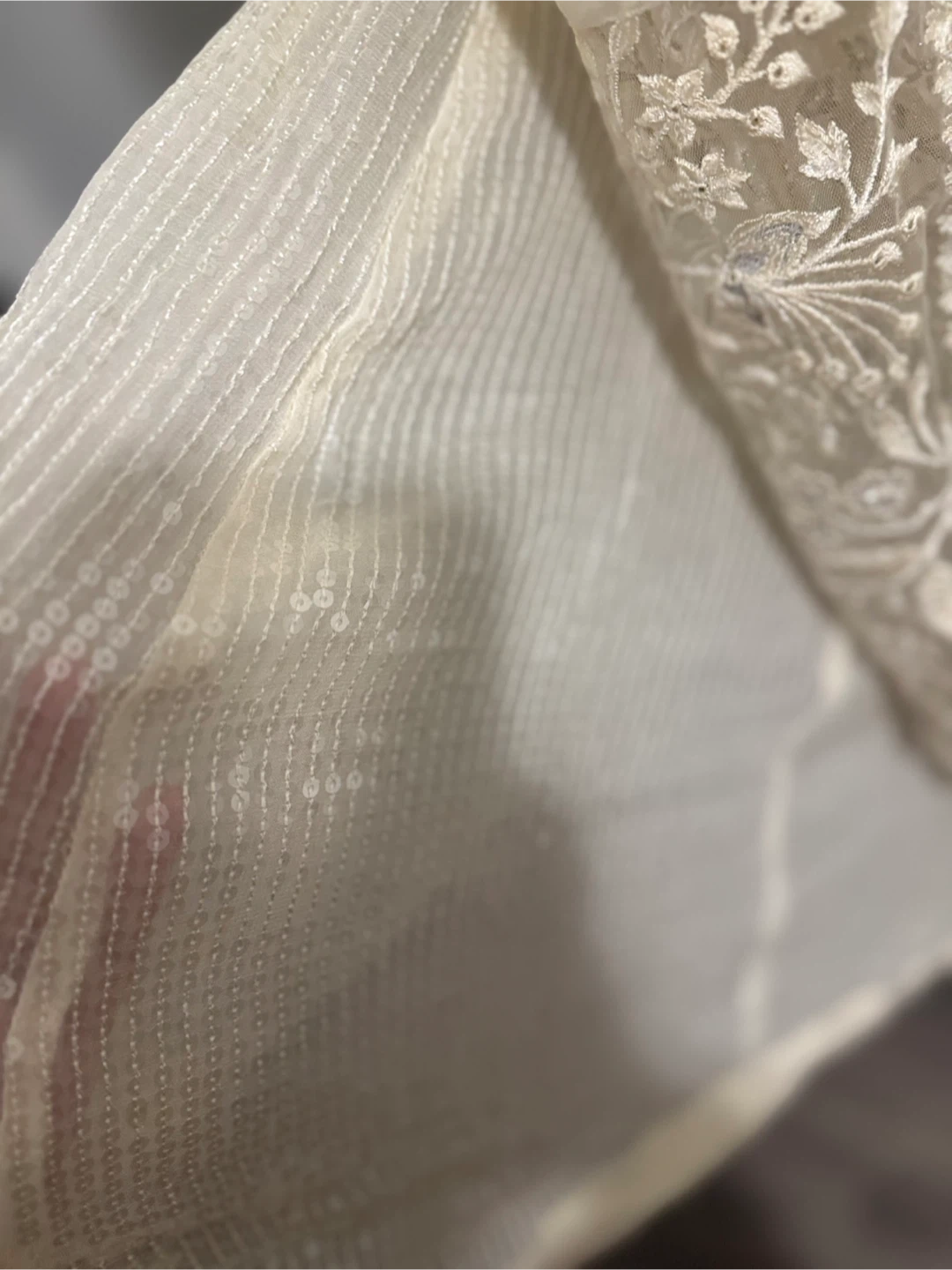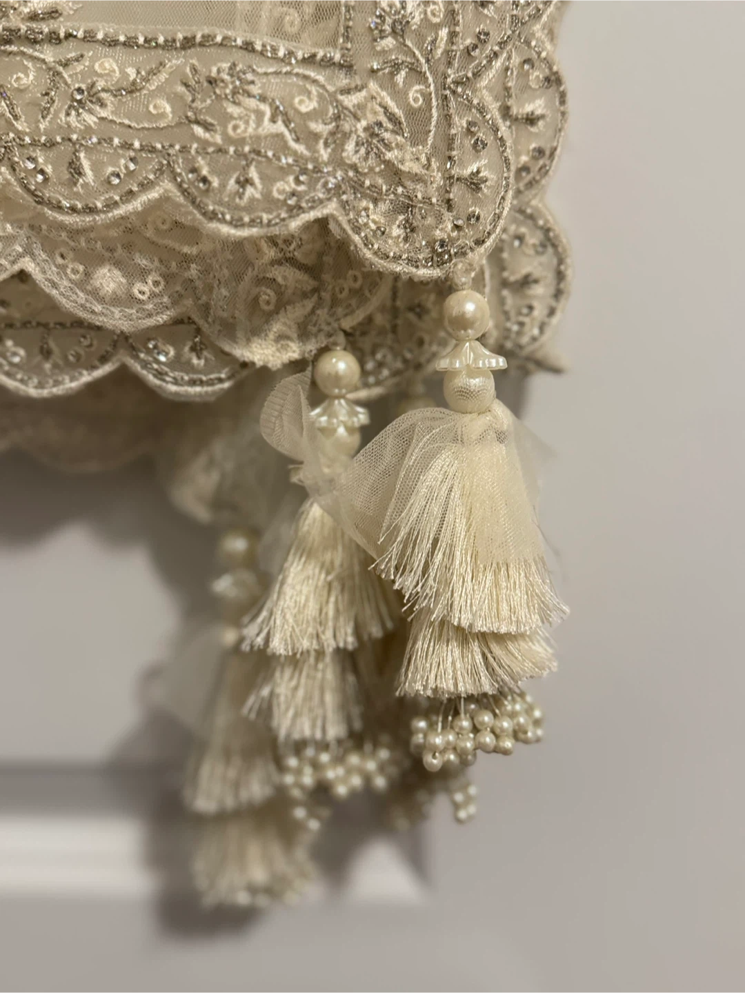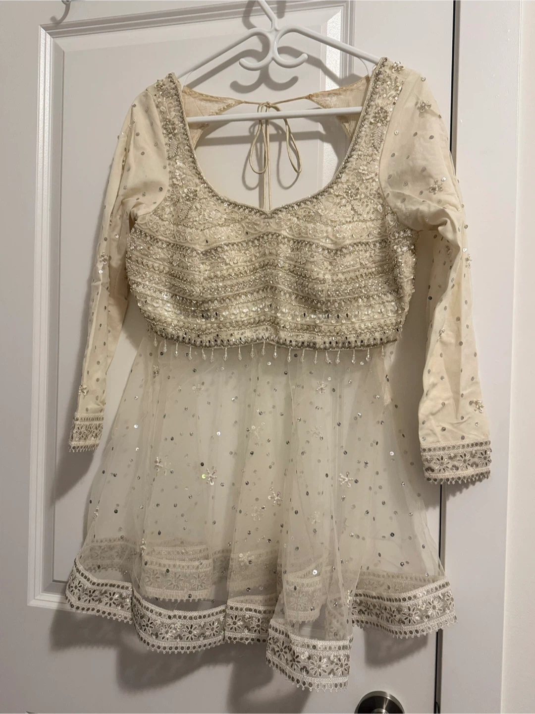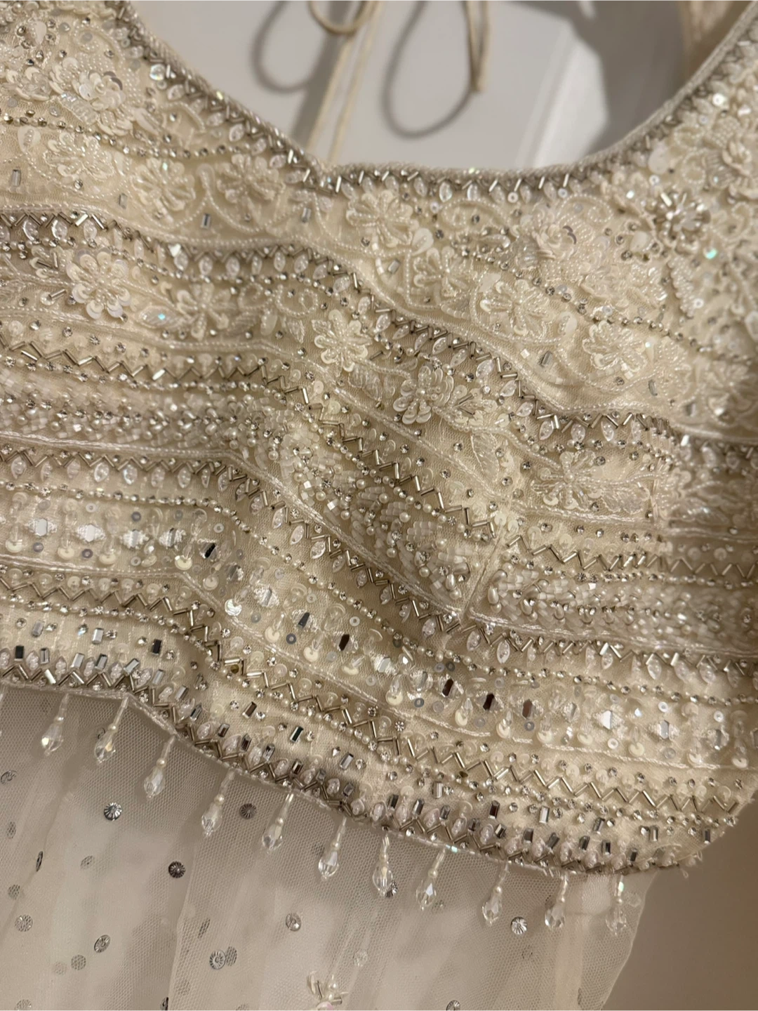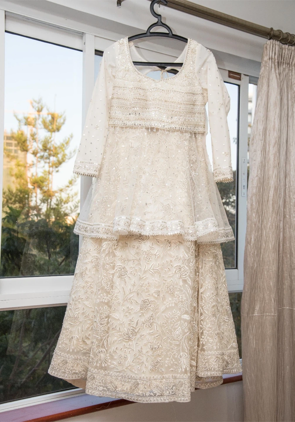 Bridal Lengha - Bridal outfit from Paaneri Dadar Thane (India) in 2024. Blouse modified into a removable peplum style. Comes with a custom-made Christian-style veil. Worn once, not dry cleaned. Features zardozi embroidery, crystals, and sequined choli lining. Material: Satin & Net. Approx Size: XL Used once for wedding wear.