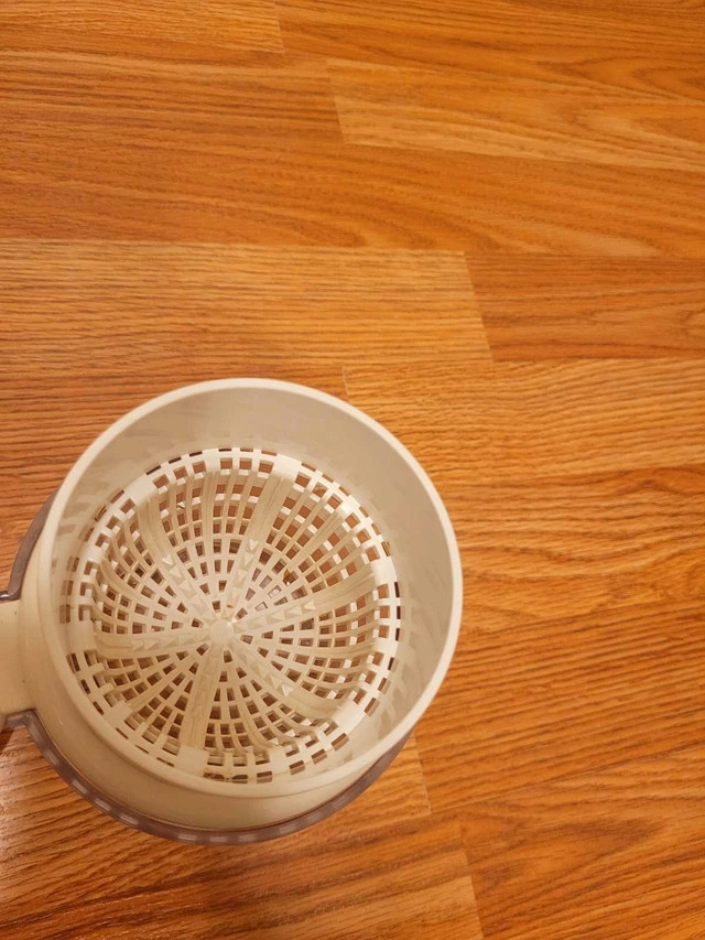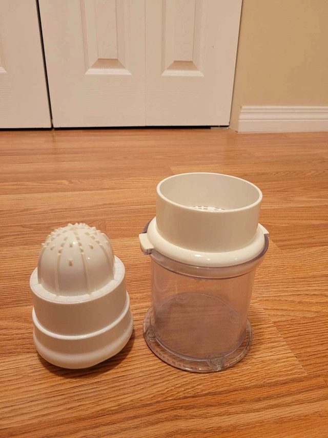 75Cream-colored manual citrus juicer with a clear container. Perfect for fresh juice. It is a kitchen tool used to extract juice from citrus fruits like lemons, limes, and oranges. The device consists of a clear plastic base that catches the juice. A white, perforated basket fits inside the base to separate the pulp and seeds from the juice. A top piece, which is also white and perforated, is used to press down on the fruit to extract the juice. In good condition For Sale By: Owner