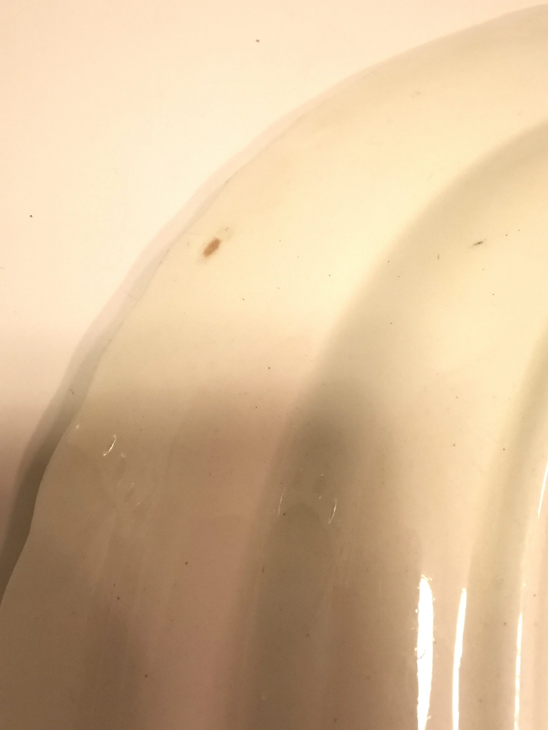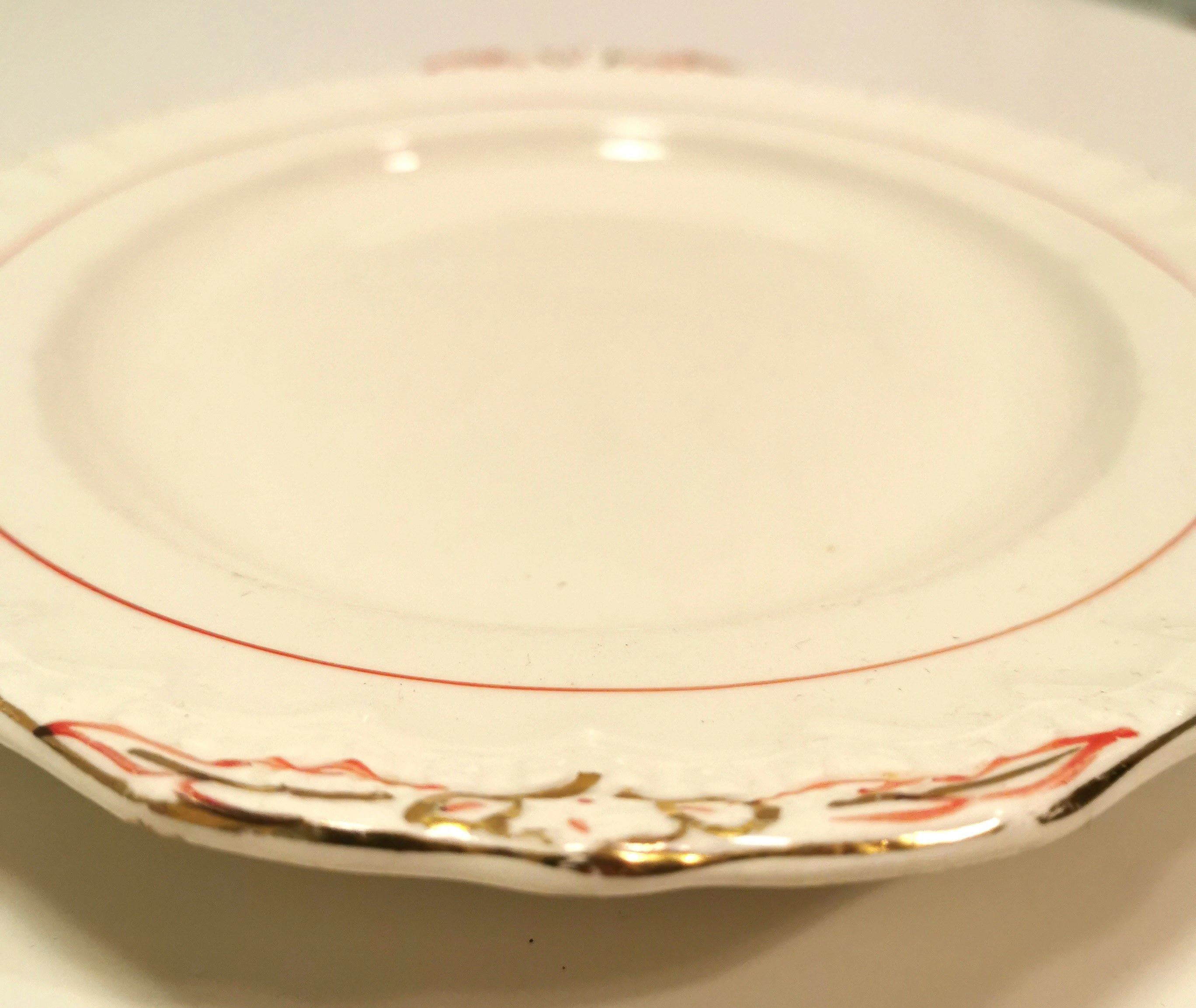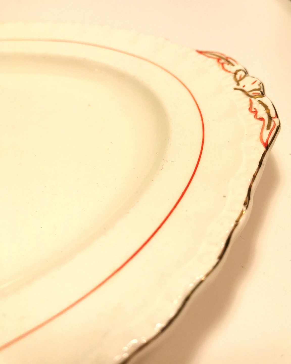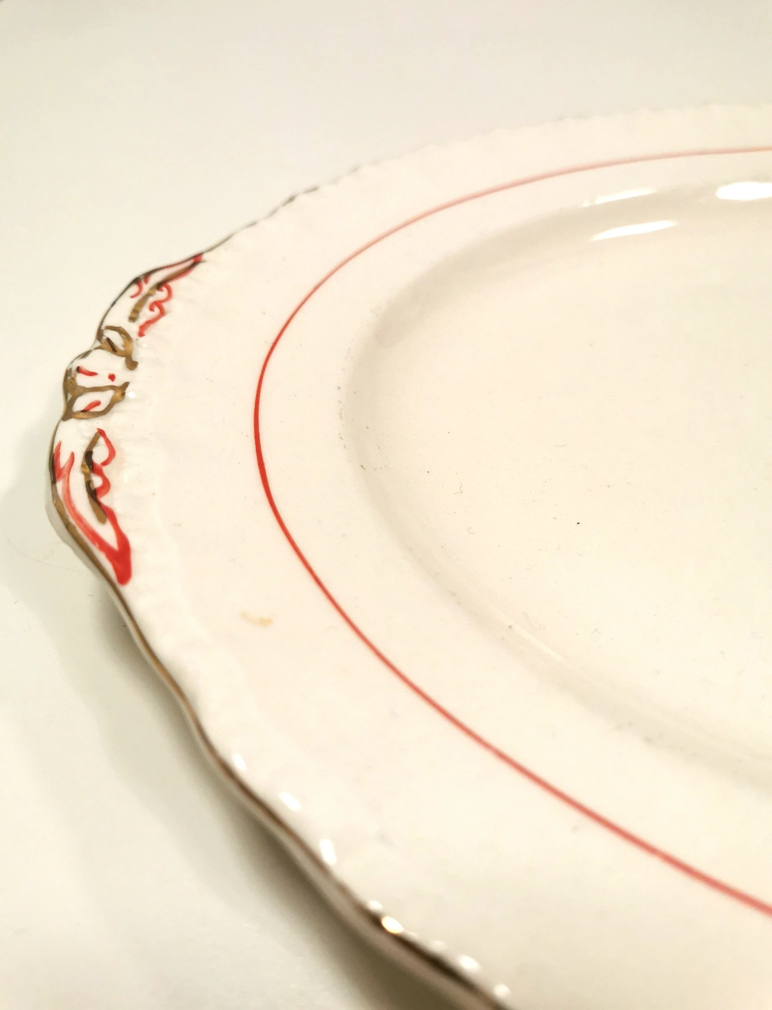 This cream oval platter with gold and red trim was made in England by Grindley. It is crafted from porcelain in an earthenware style. The classic design and elegant color scheme make it a stylish addition to any table setting. Dimensions- Length 12.5 inches, Width 10 inches, Height 1 inch Approx. Condition: Vintage item light wear please reference photos as part of the description.