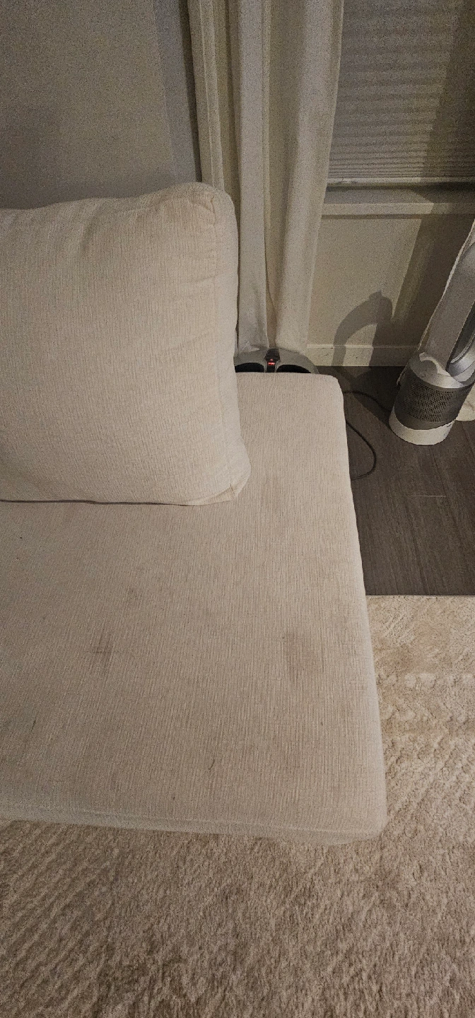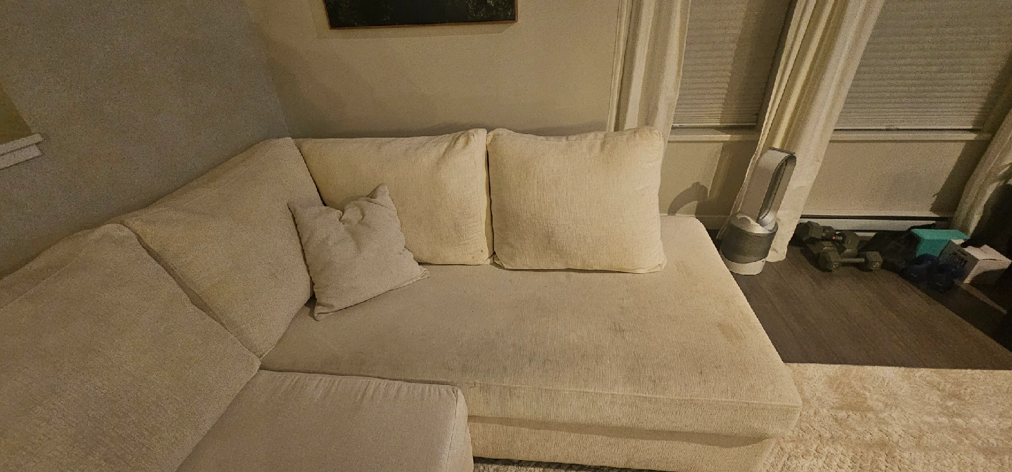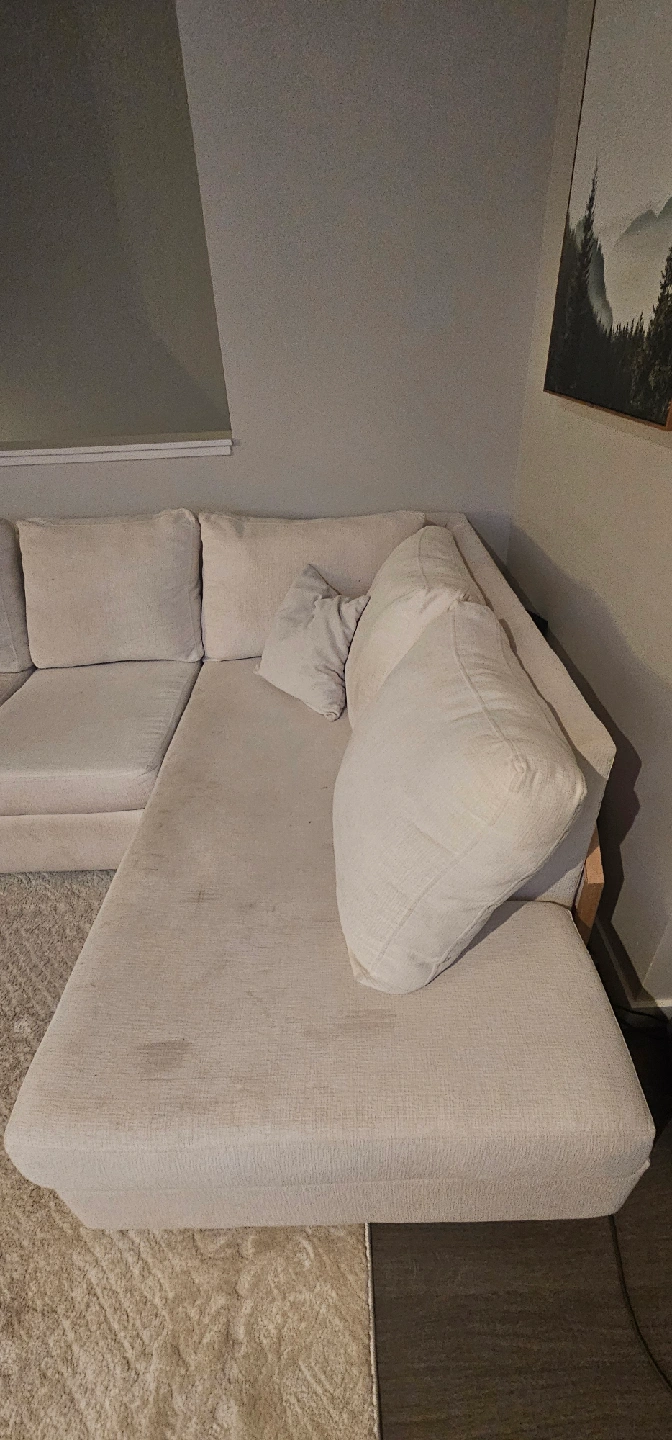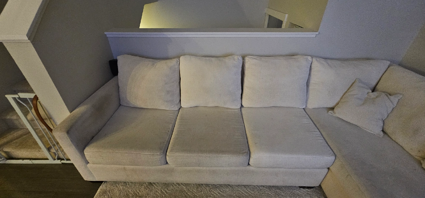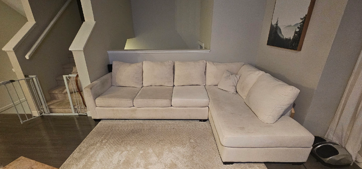 Selling a cream sectional sofa. It's a comfortable piece for any living room. There are some signs of use, but overall it's in good condition and ready for a new home. I just needs a good cleaning. Covers are washable. Only 3 years old. Paid $3000 for it.