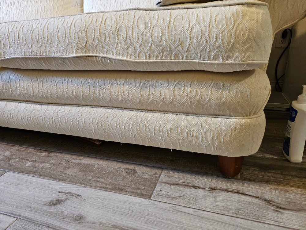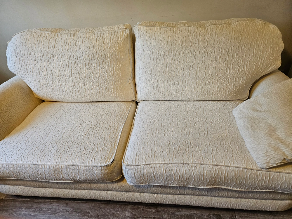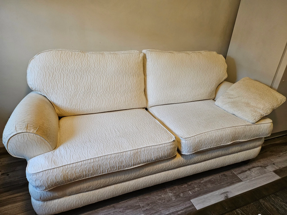 10Selling a two seater comfy cream-coloured sofa. It's in gently used condition and is clean! The back seat cushions and lower cushions both have covers that can be taken off for cleaning. Perfect for a living room or den and offers a cozy spot to relax. It's dimensions are below Length: 70 inches Width: 31 inches Height: 32 inches Price is only 25 dollars.