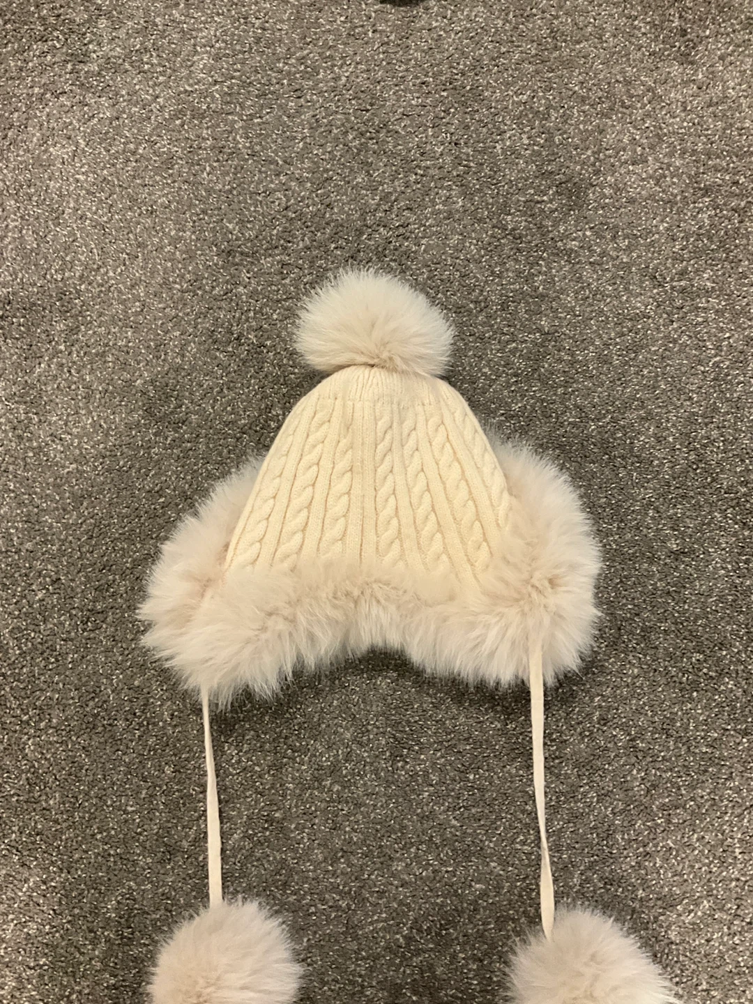 5Cozy up with this adorable cream-coloured trapper hat! It features a soft knit design with a faux fur trim and cute pom-poms. Perfect for keeping warm on chilly Canadian days!