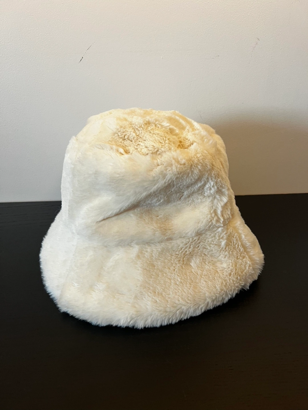 Adorable cream-coloured bucket hat. Soft faux fur material. UCHUU Studio brand. Perfect for winter.