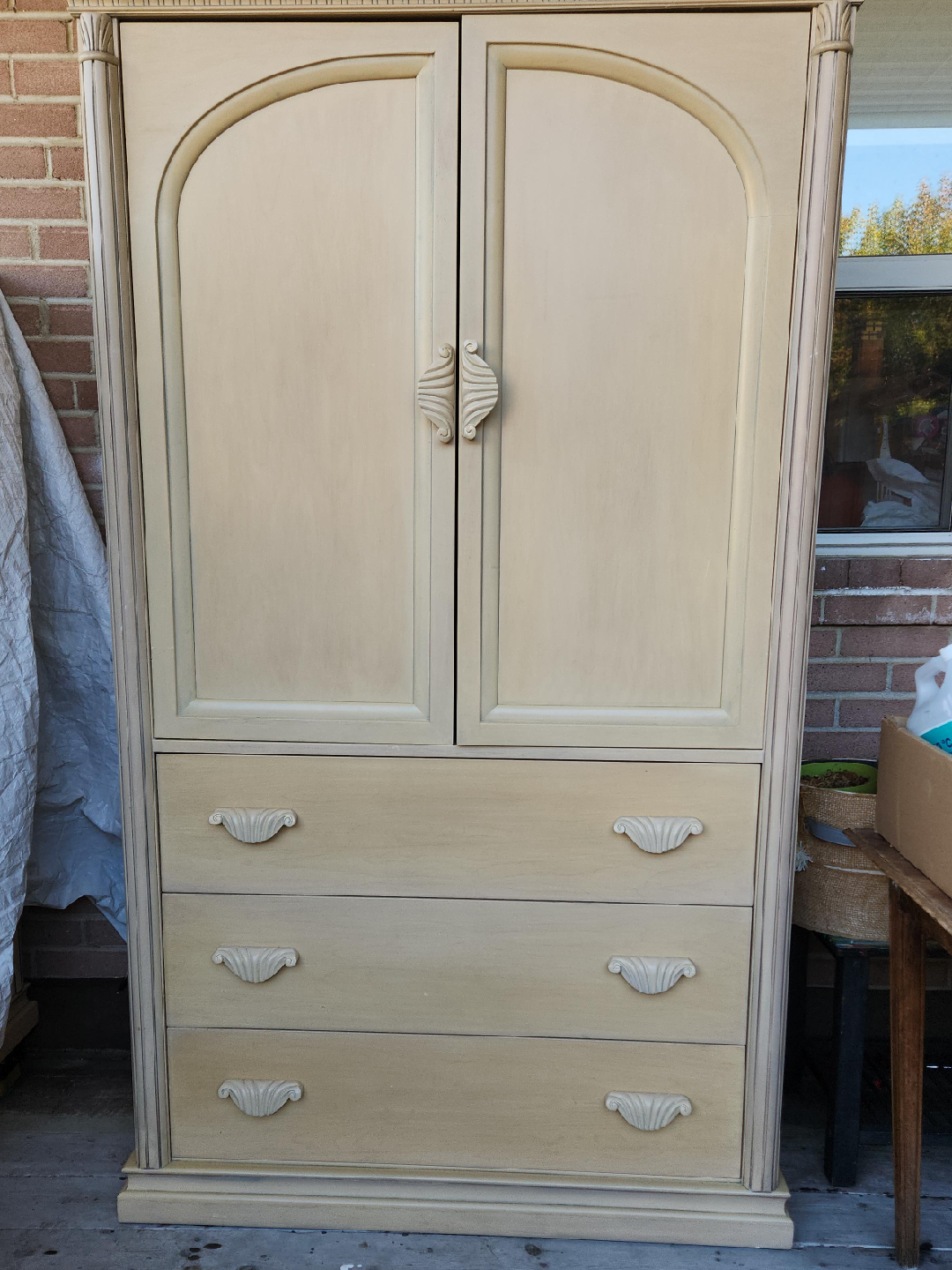 This is a lovely cream-coloured wardrobe with plenty of storage! It features two doors on top and three drawers below. The handles have a cute shell design. It's a great piece to add to any bedroom or living space!