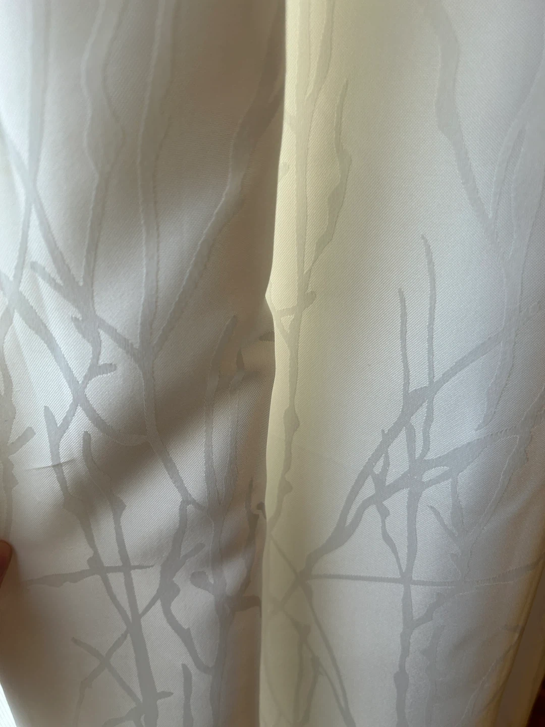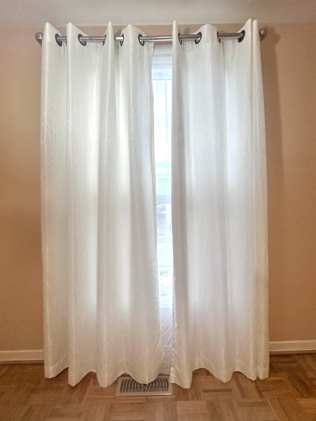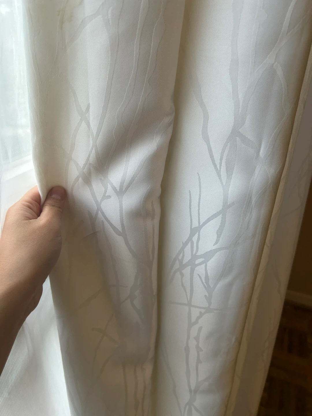 323Selling a set of white curtains with a subtle tree branch pattern. They're in great condition and would look lovely in any room. The material is soft and lets in a good amount of light while still providing privacy. Perfect for adding a touch of elegance to your home!
