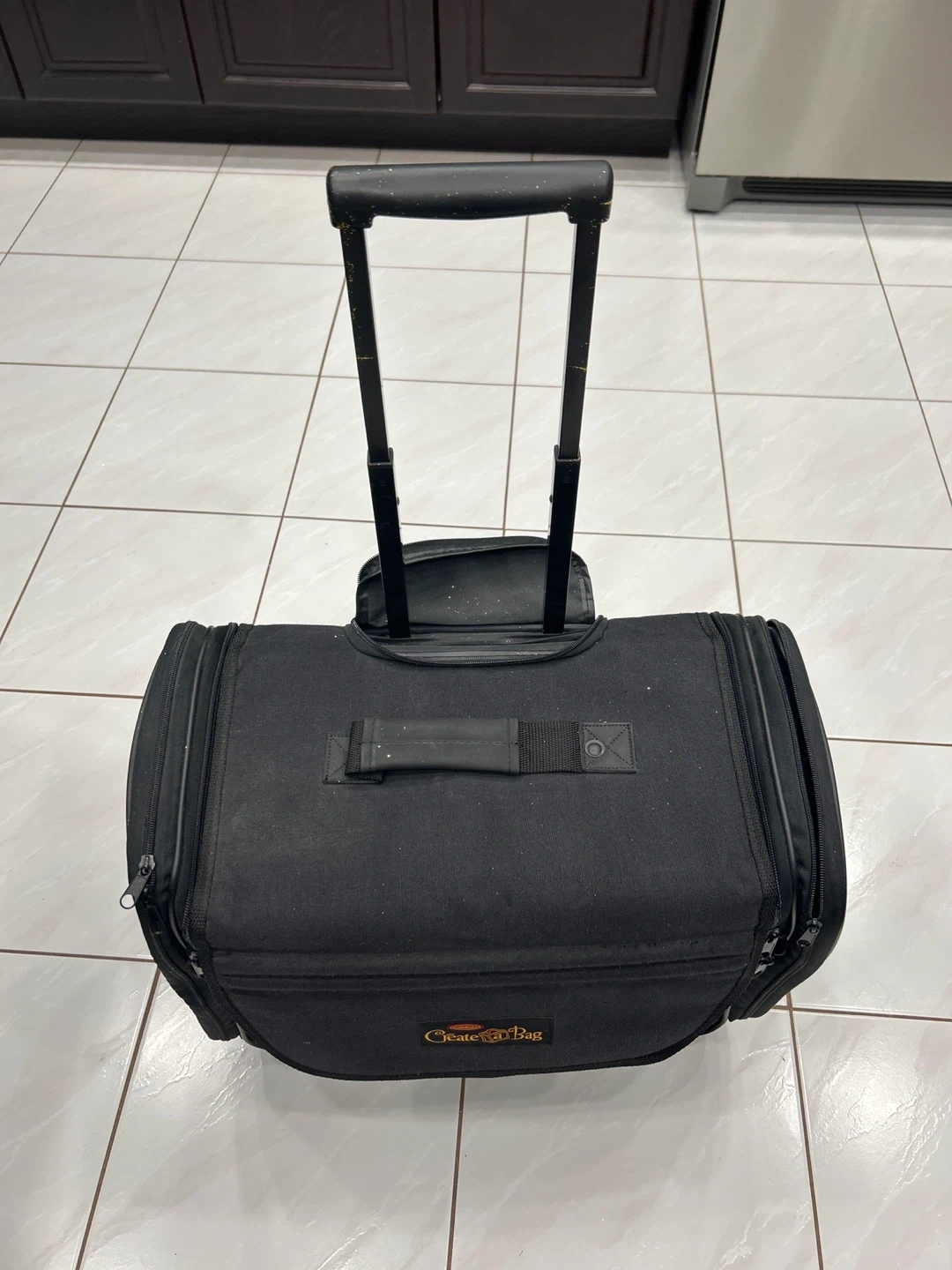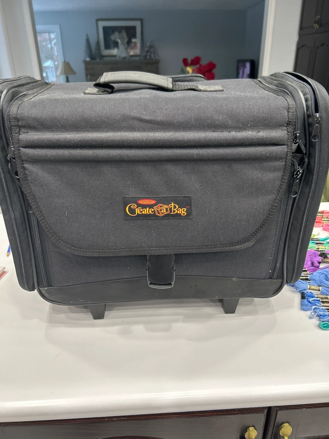 22Selling a gently used Create-A-Bag rolling craft tote. It's black and has a retractable handle, perfect for crafters on the go! There are interior mesh pockets for organizing your supplies. It shows some signs of use but is in good working condition