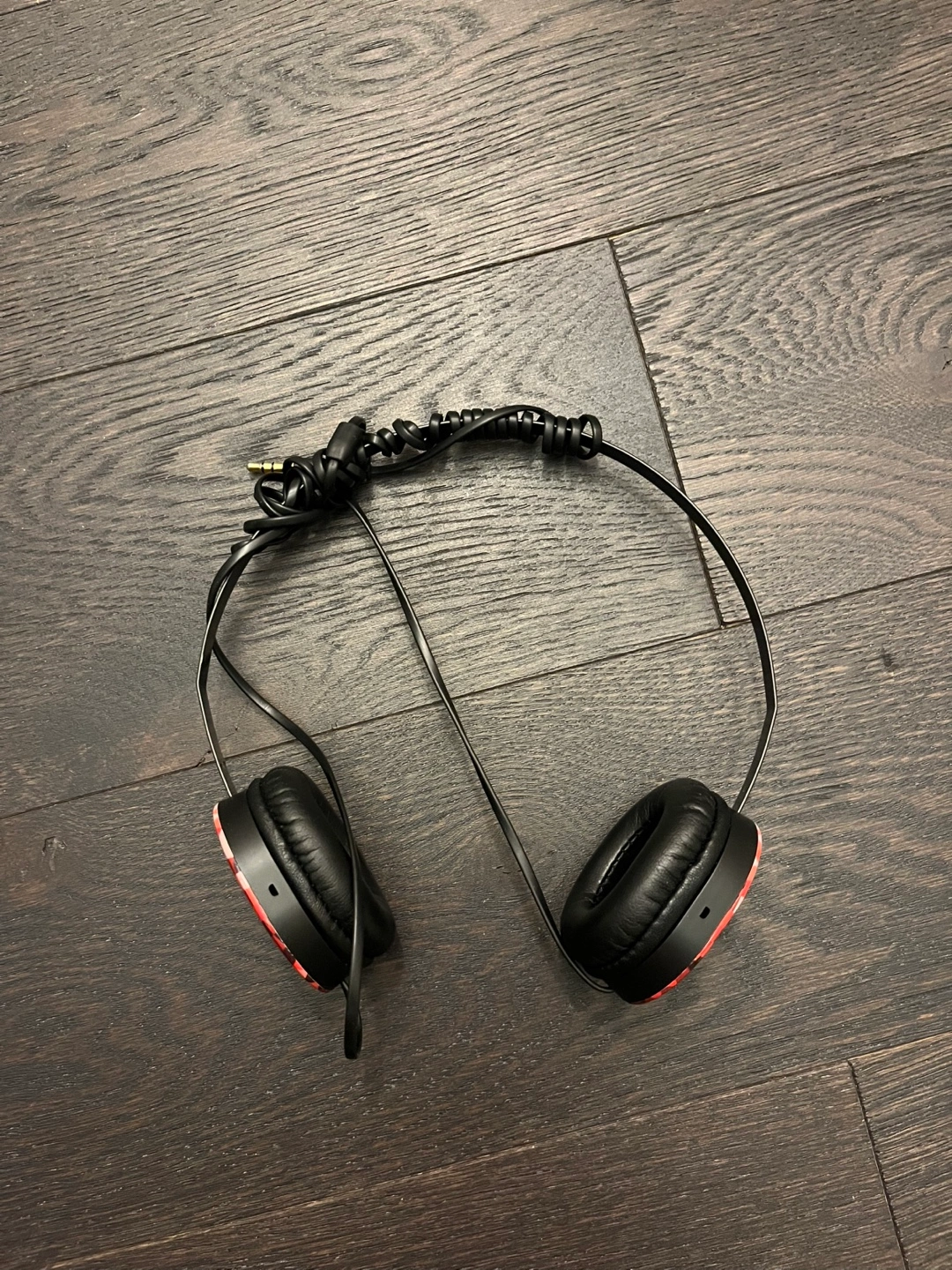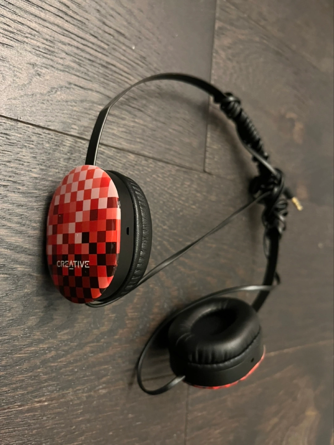61Wired on-ear headphones. Red pixelated design. Good for casual listening. Lightweight and comfortable.