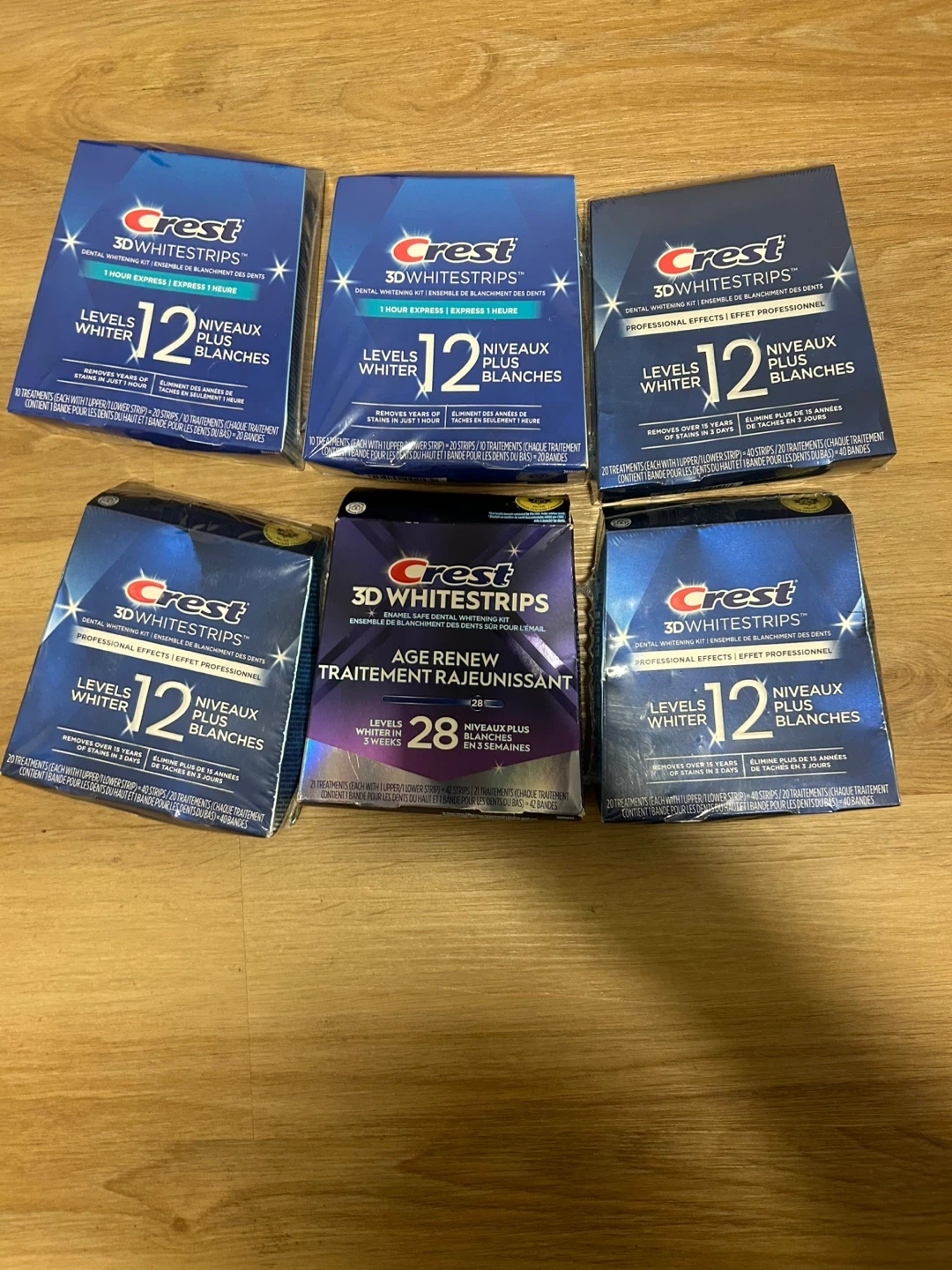 Selling a variety pack of Crest 3D Whitestrips! Includes: - 1 Hour Express (12 levels whiter) - Professional Effects (12 levels whiter, removes over 15 years of stains) - Age Renew (28 levels whiter in 3 weeks) 100$ for all 15$ for one level 28 30$