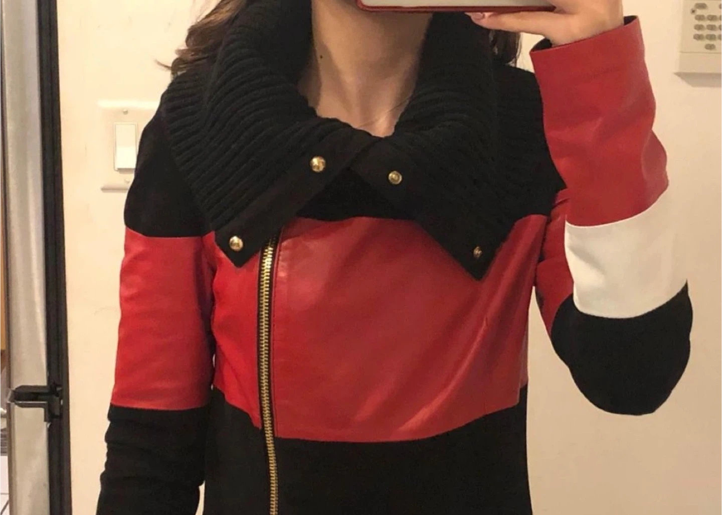 This stylish jacket features a unique colour block design with red, white, and black panels. It has a comfortable knit collar and a front zipper closure.